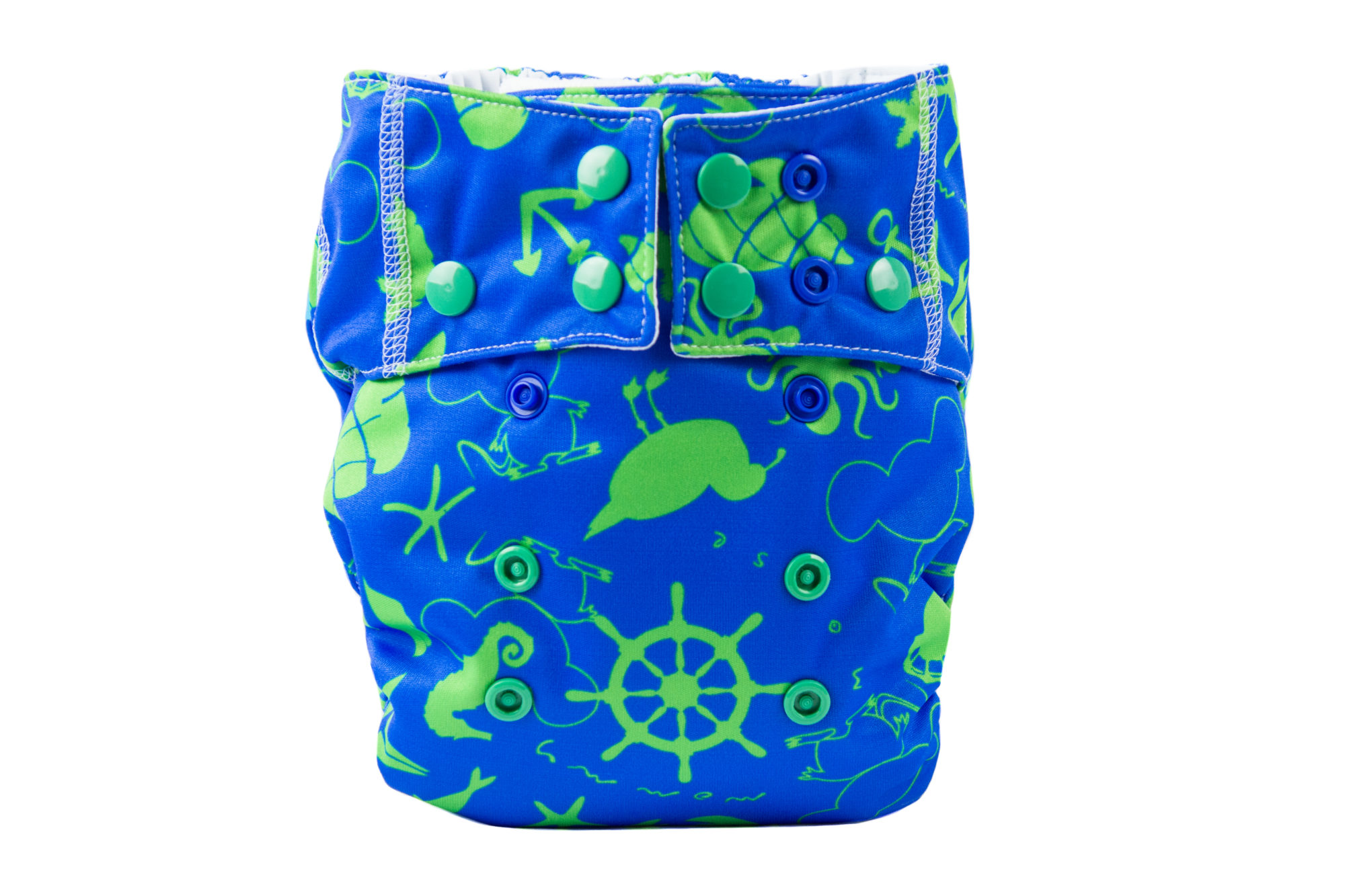 The entire diaper has been very carefully designed. The diaper consists of a colourful, waterproof PUL fabricon which the absorbent part of the diaper is sewn into.