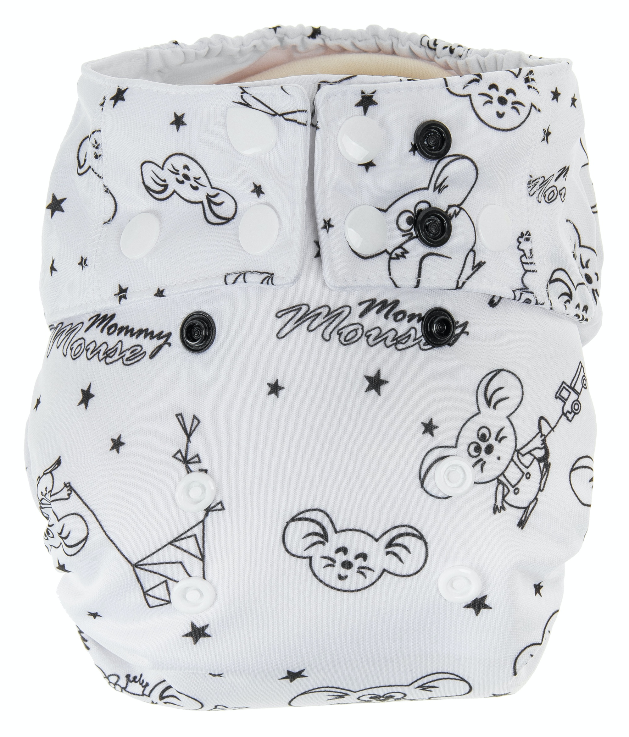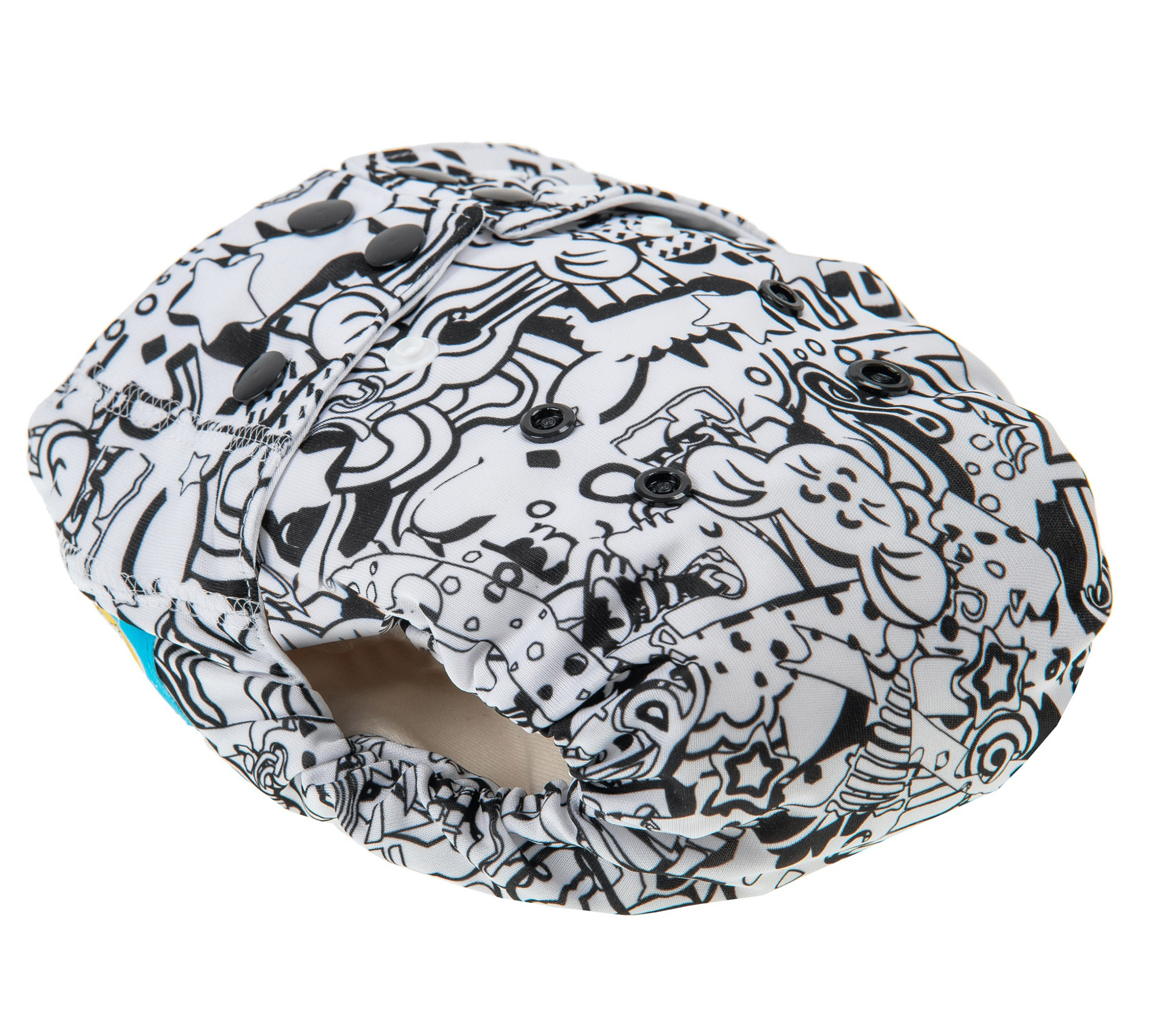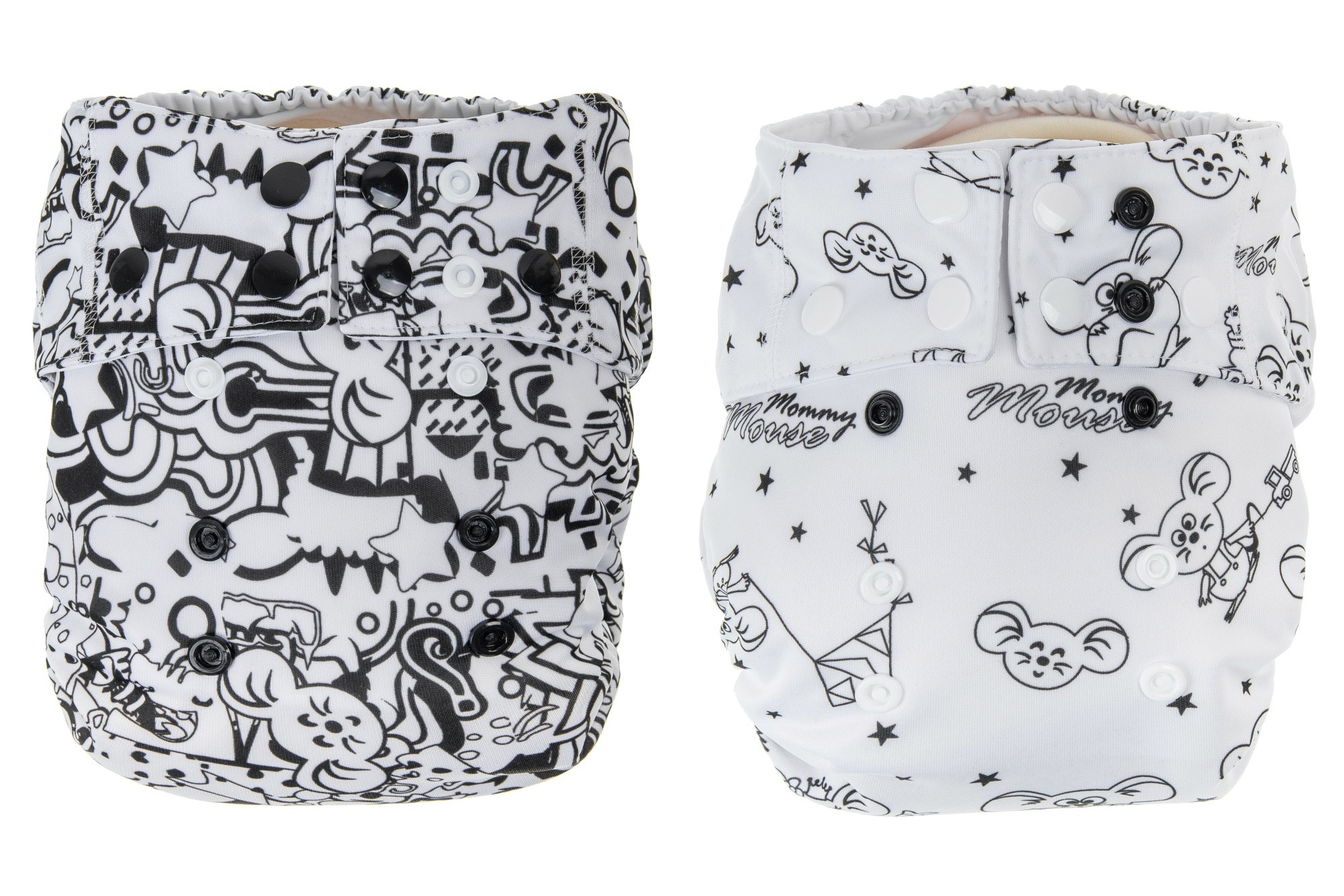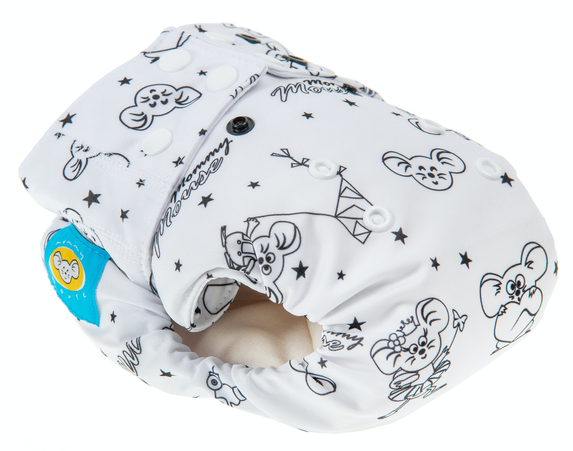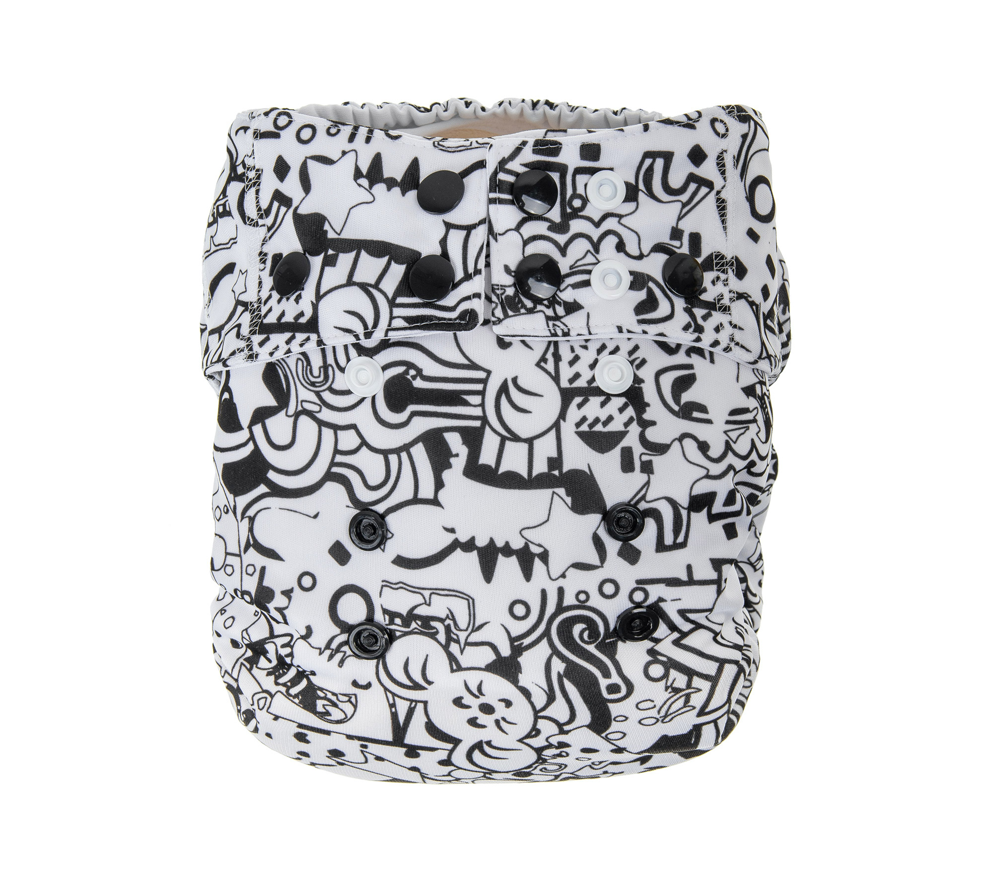 The entire diaper has been very carefully designed. The diaper consists of a colourful, waterproof PUL fabricon which the absorbent part of the diaper is sewn into.