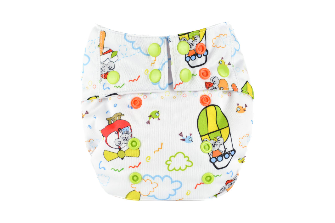 The entire diaper has been very carefully designed. The diaper consists of a colourful, waterproof PUL fabricon which the absorbent part of the diaper is sewn into.