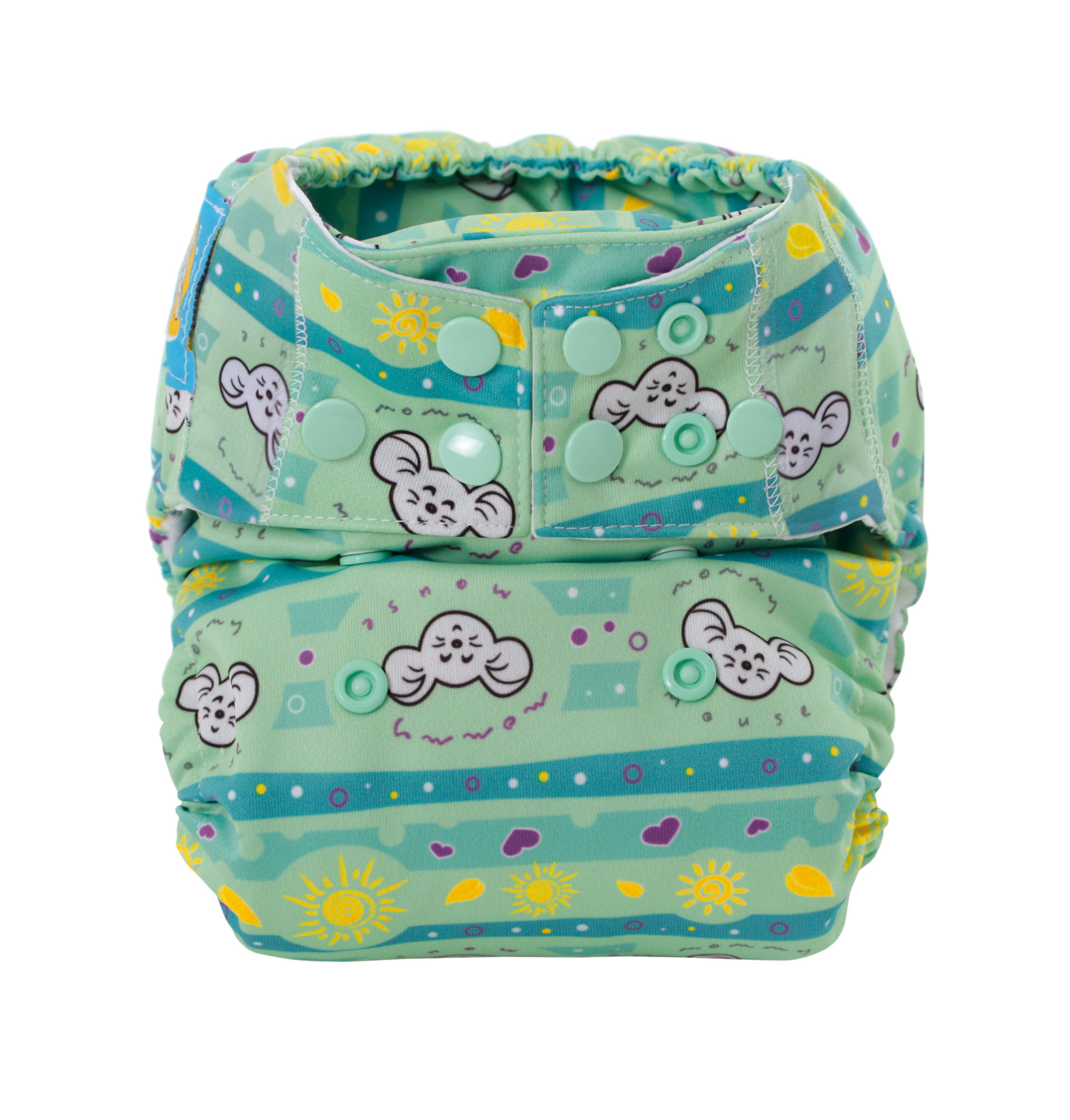 The entire diaper has been very carefully designed. The diaper consists of a colourful, waterproof  PUL fabricon which the absorbent part of the diaper is sewn into.