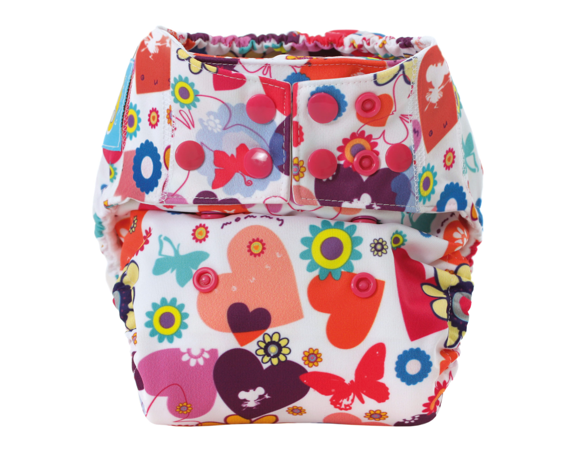 The entire diaper has been very carefully designed. The diaper consists of a colourful, waterproof PUL fabricon which the absorbent part of the diaper is sewn into.