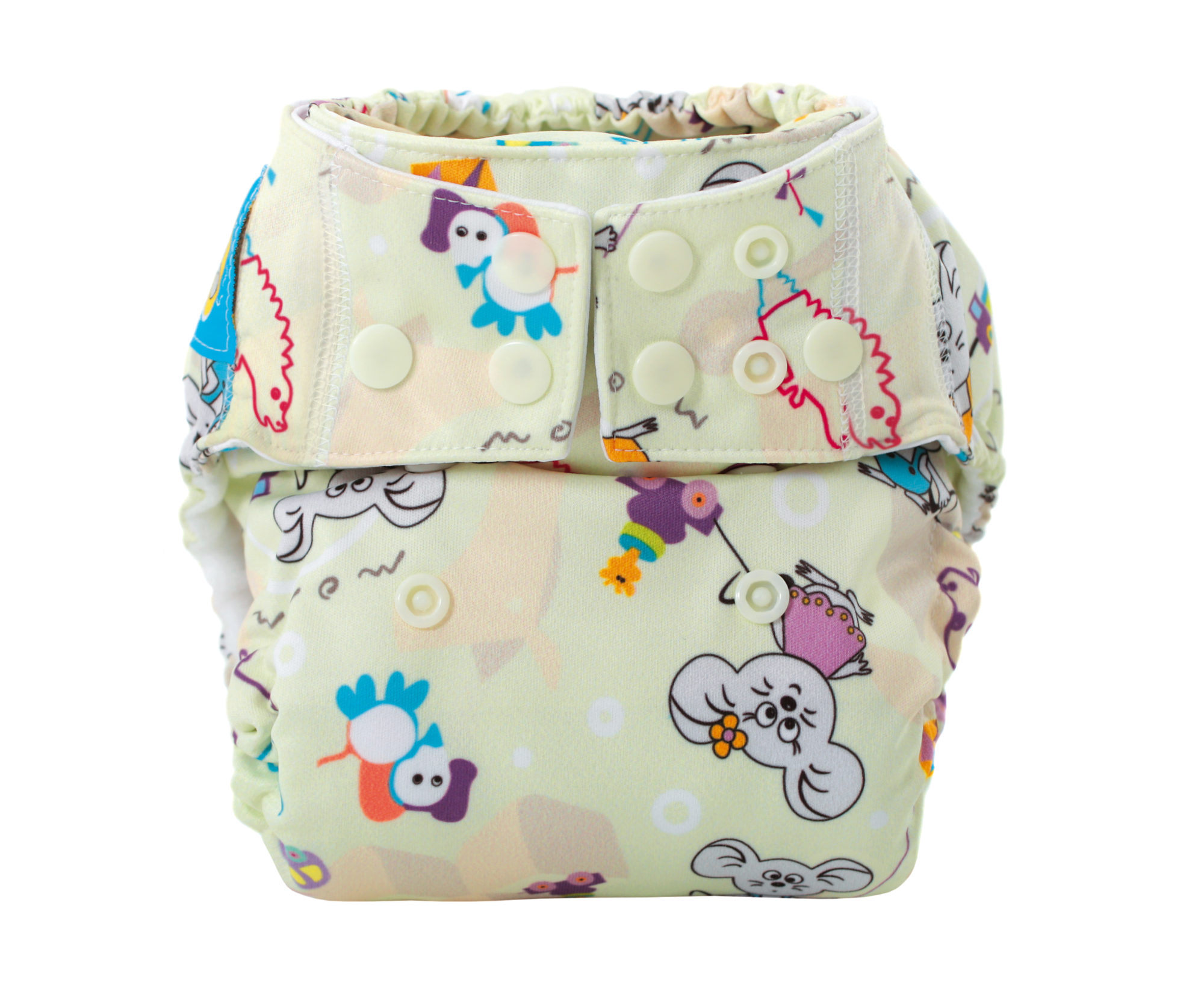 The entire diaper has been very carefully designed. The diaper consists of a colourful, waterproof  PUL fabricon which the absorbent part of the diaper is sewn into.
