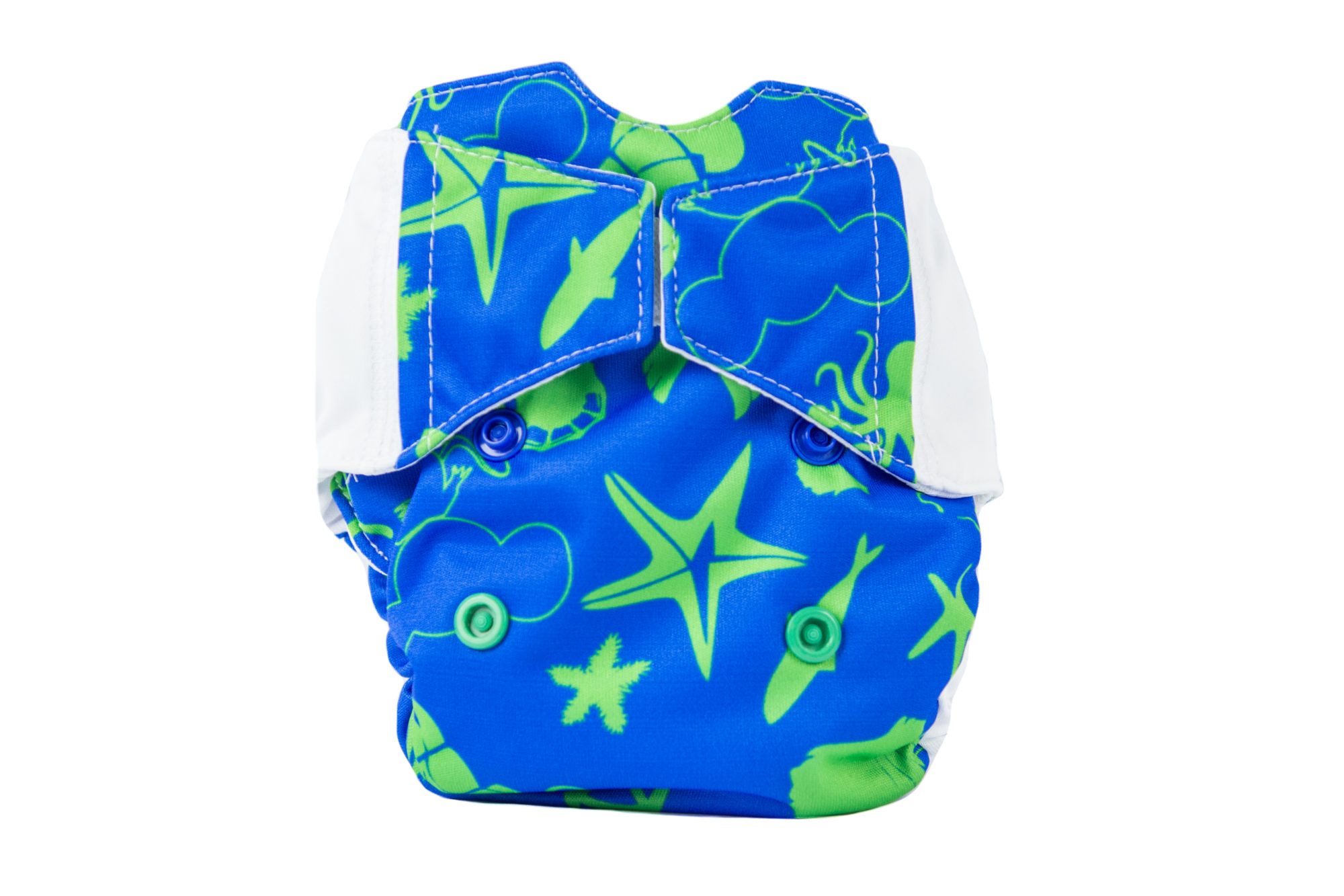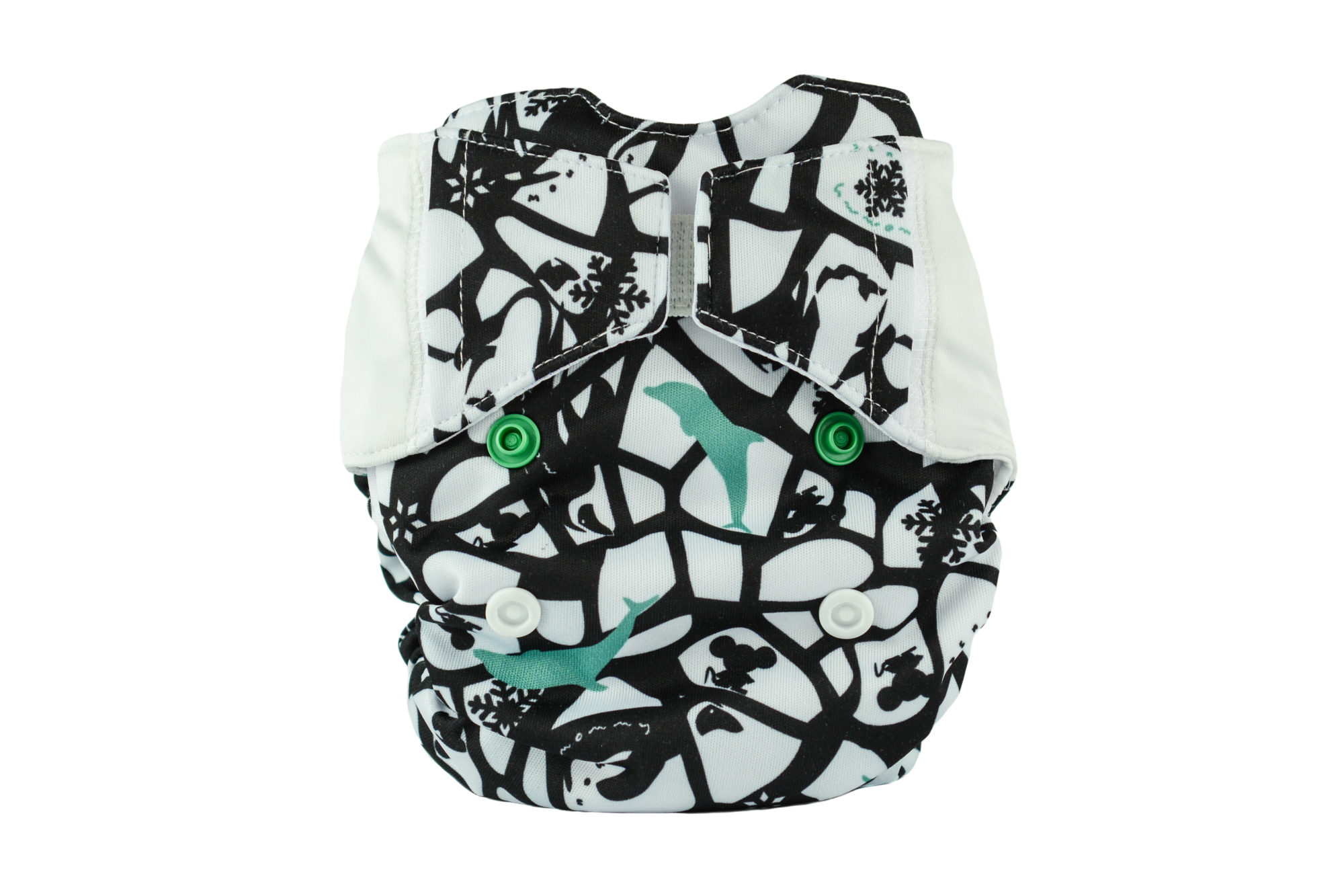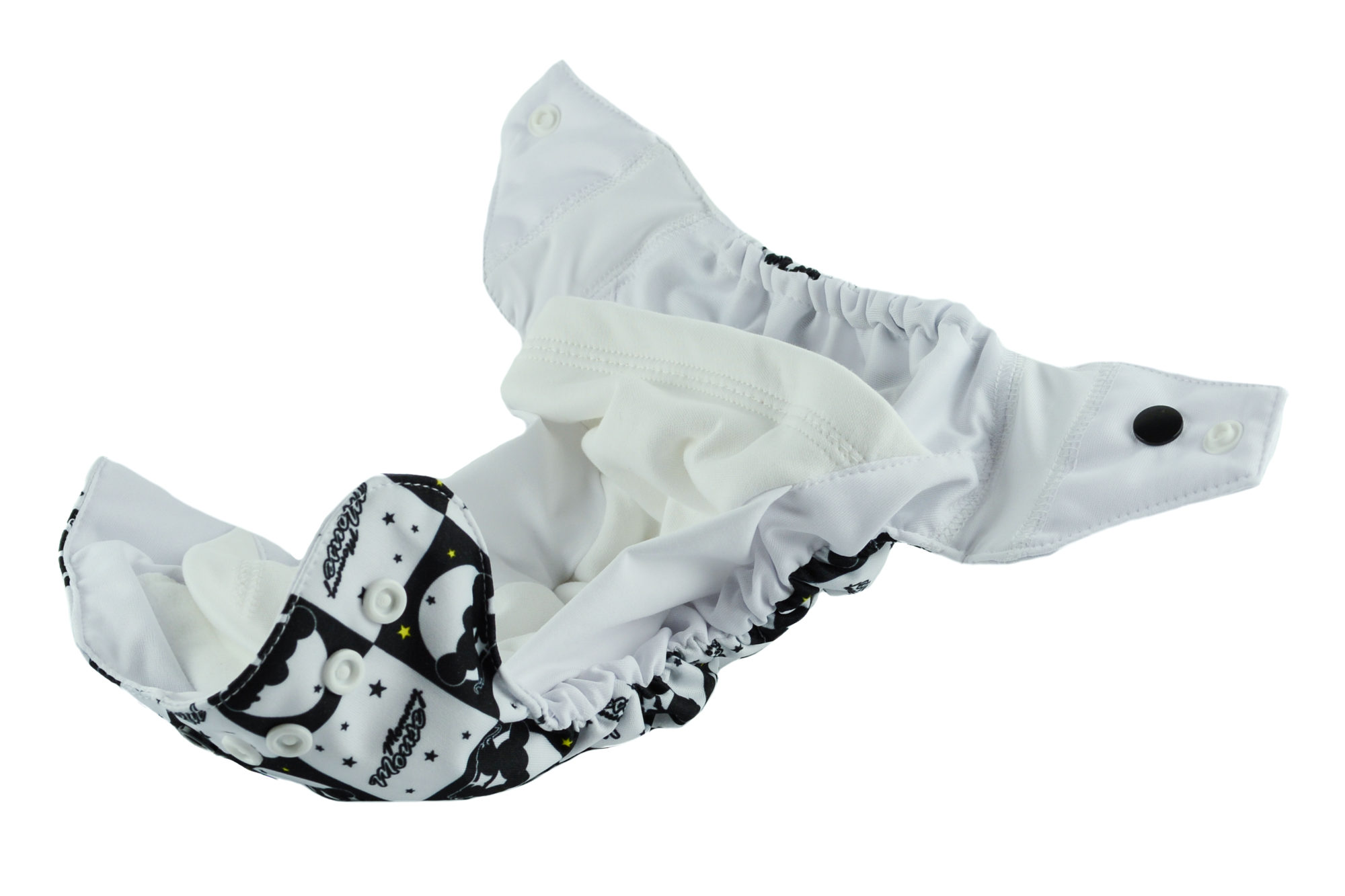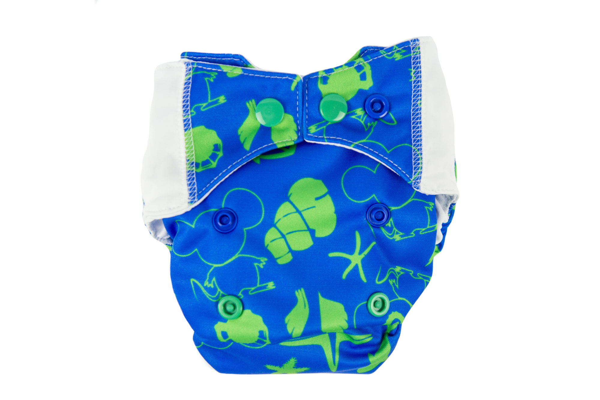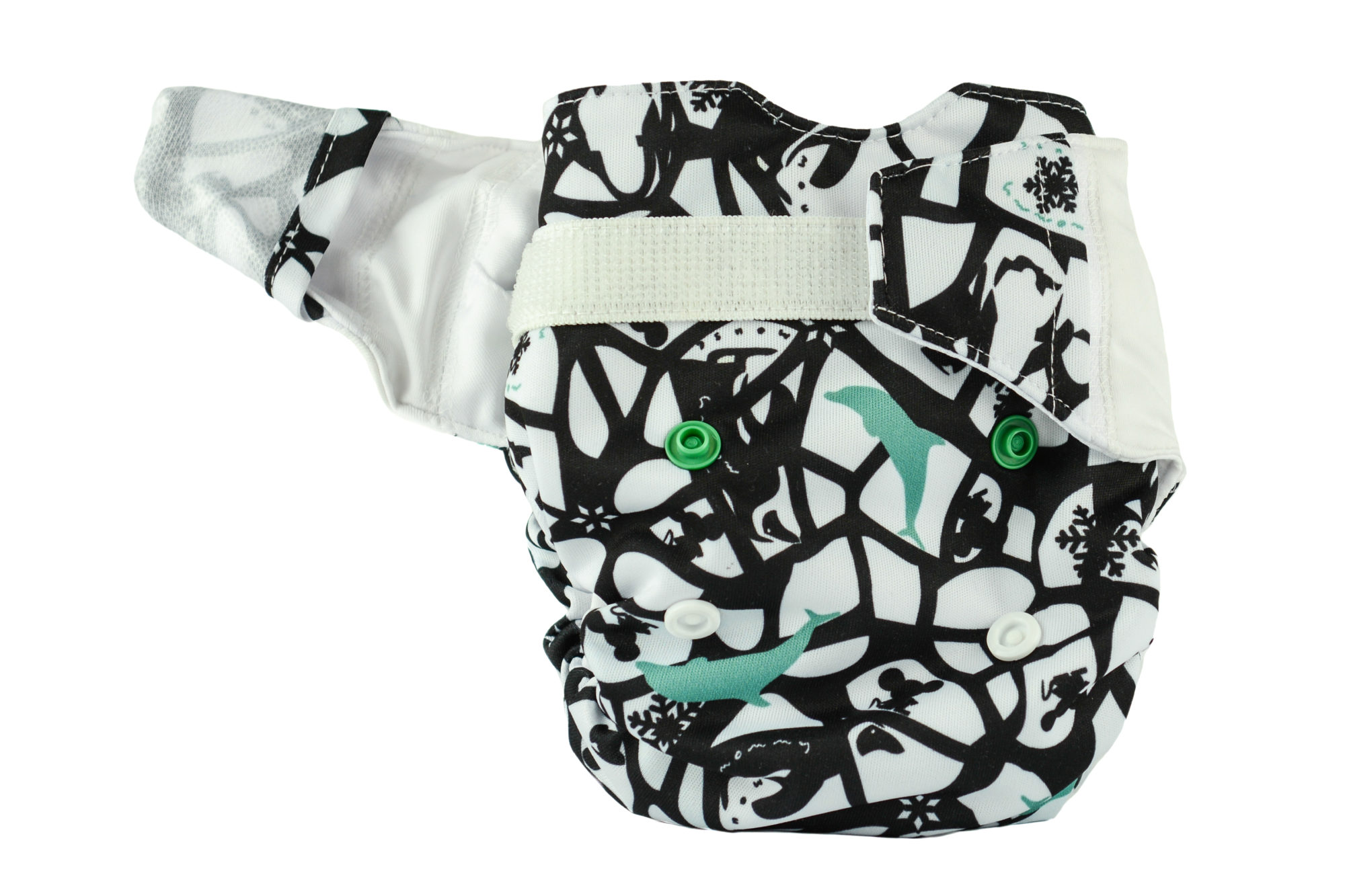The diaper consists of a colourful, waterproof PUL which protects the clothes from leakage. It is integrated with the absorbent part of the diaper.