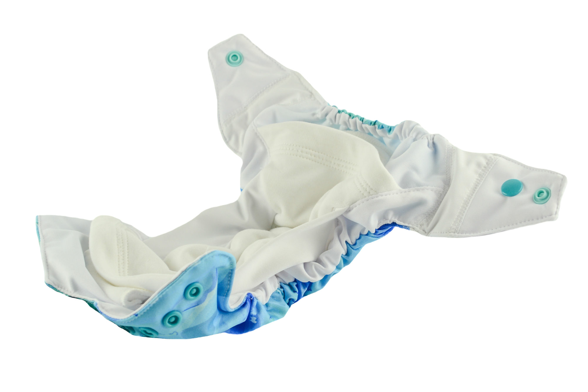 The diaper consists of a colourful, waterproof PUL which protects the clothes from leakage. It is integrated with the absorbent part of the diaper.