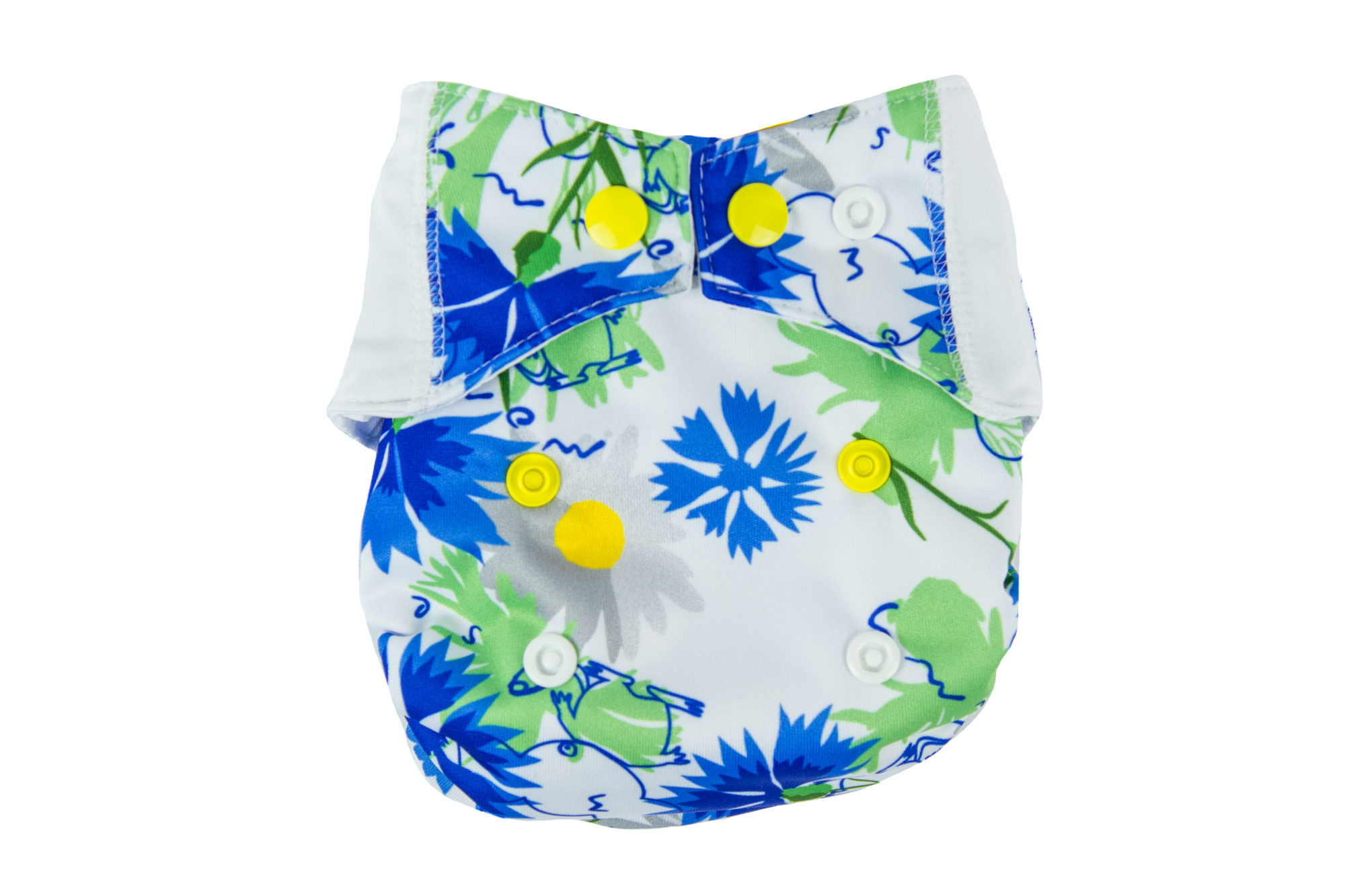 A delicate elastic on the back of the diaper and a flexible flap element sewn together with snaps allows for precise and adjustment of the diaper without causing any imprints the child’s skin.
