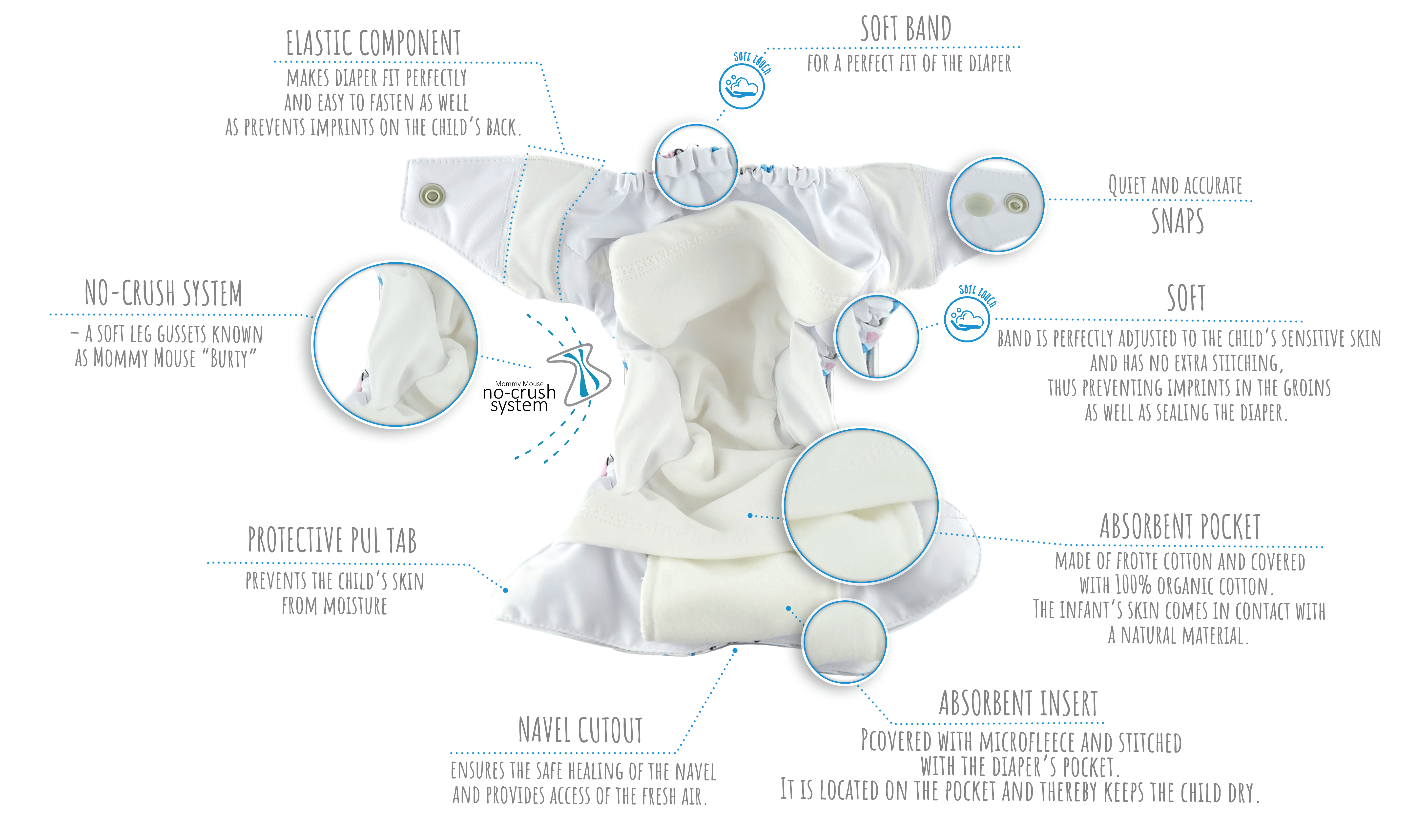 The AIO diaper has a built in NO-CRUSH SYSTEM that has been designed especially for new born babies. Its design takes into account the specific requirements of the child from the first moments of life. It provides comfort and convenience for the