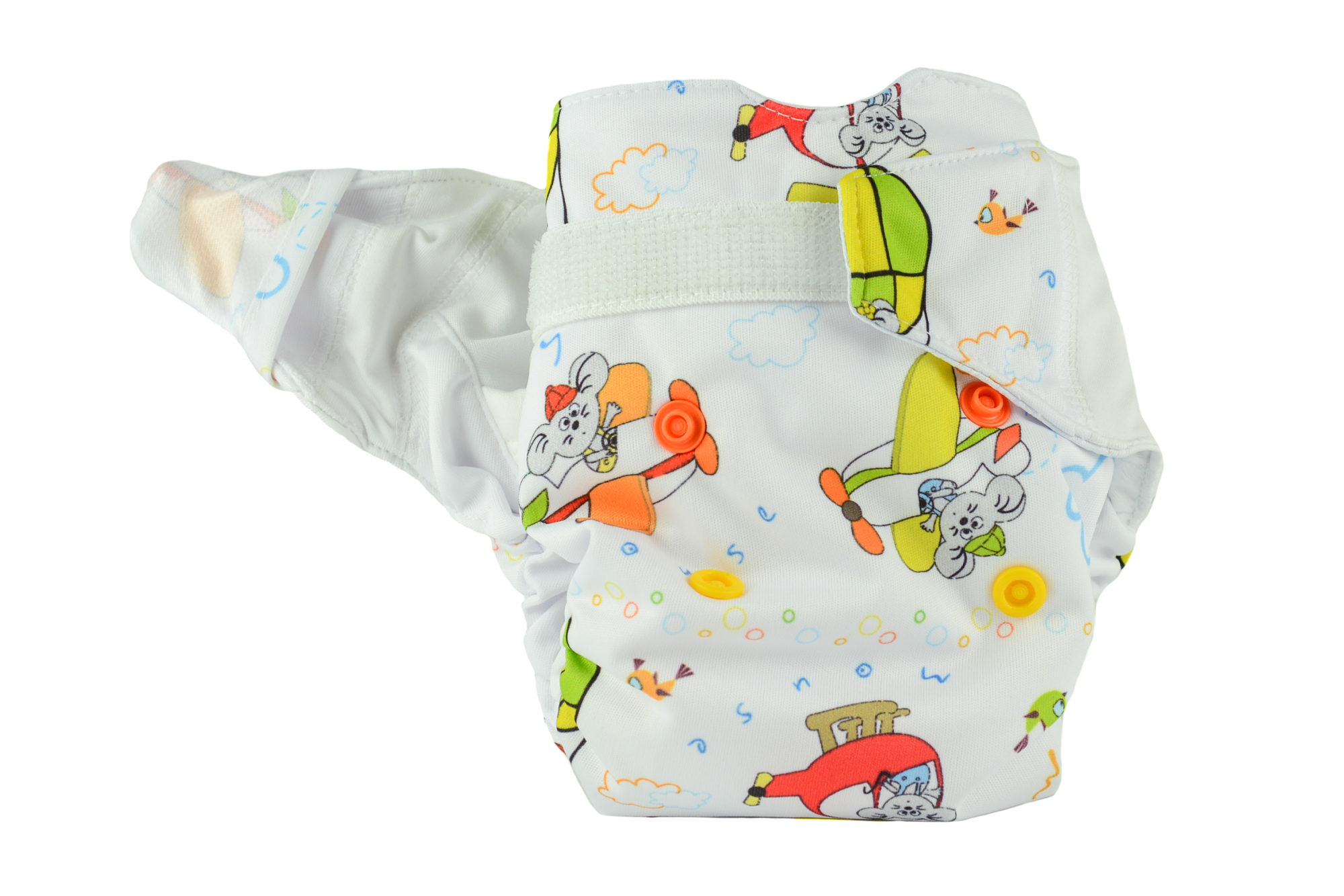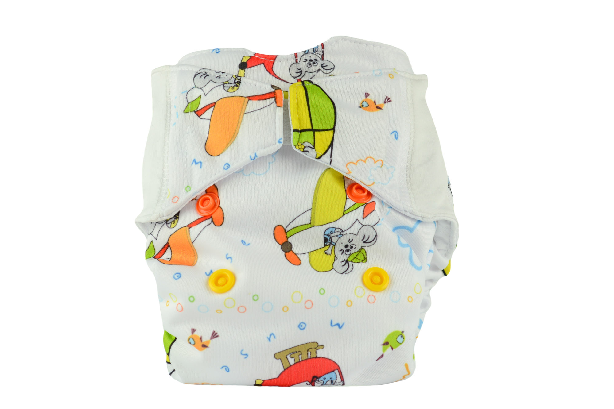 The diaper consists of a colourful, waterproof PUL which protects the clothes from leakage. It is integrated with the absorbent part of the diaper.