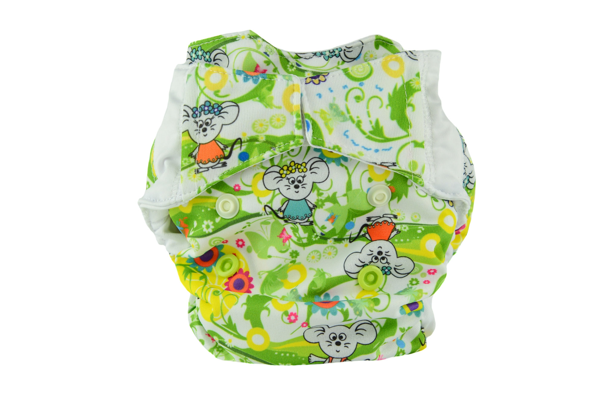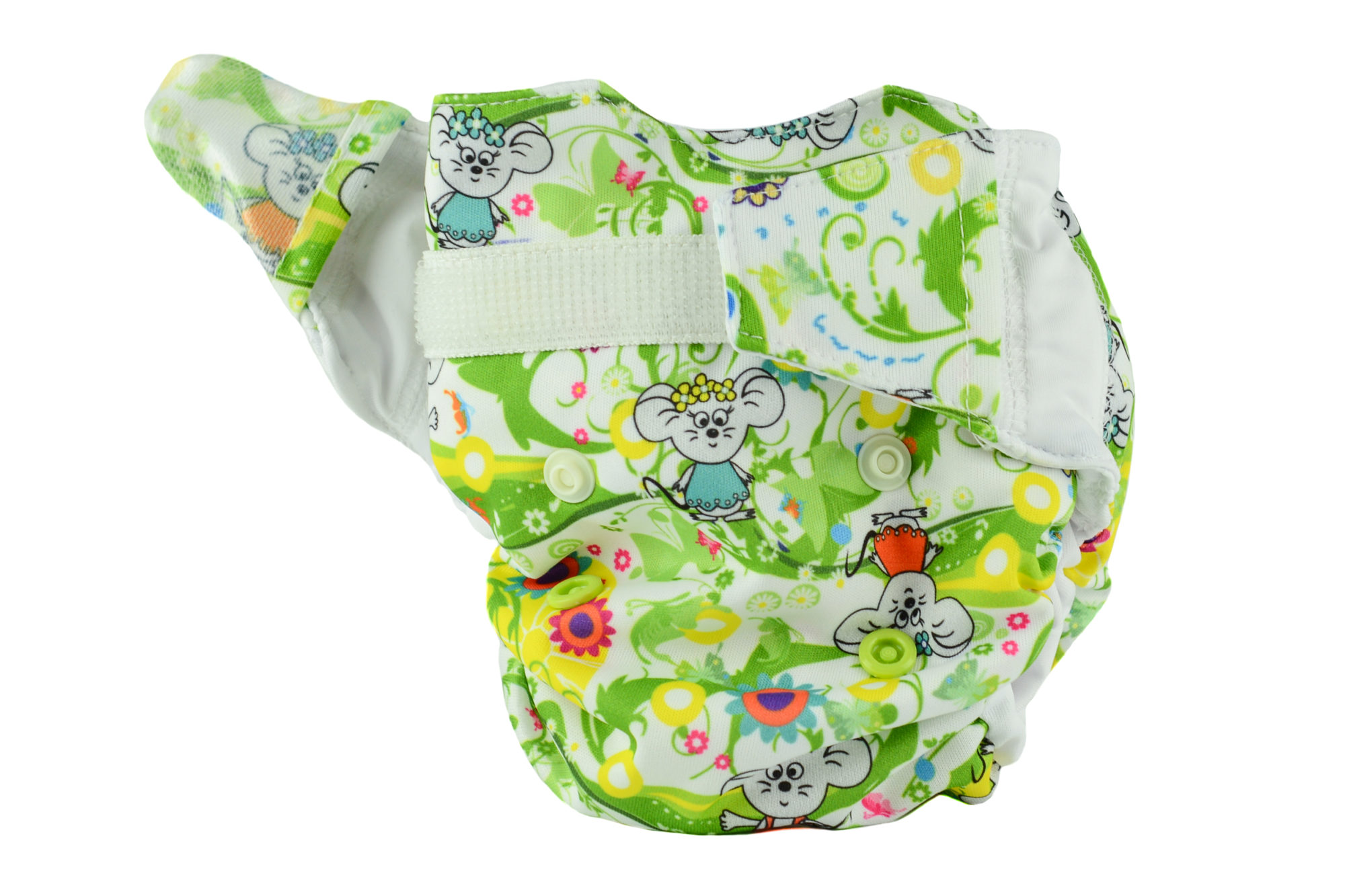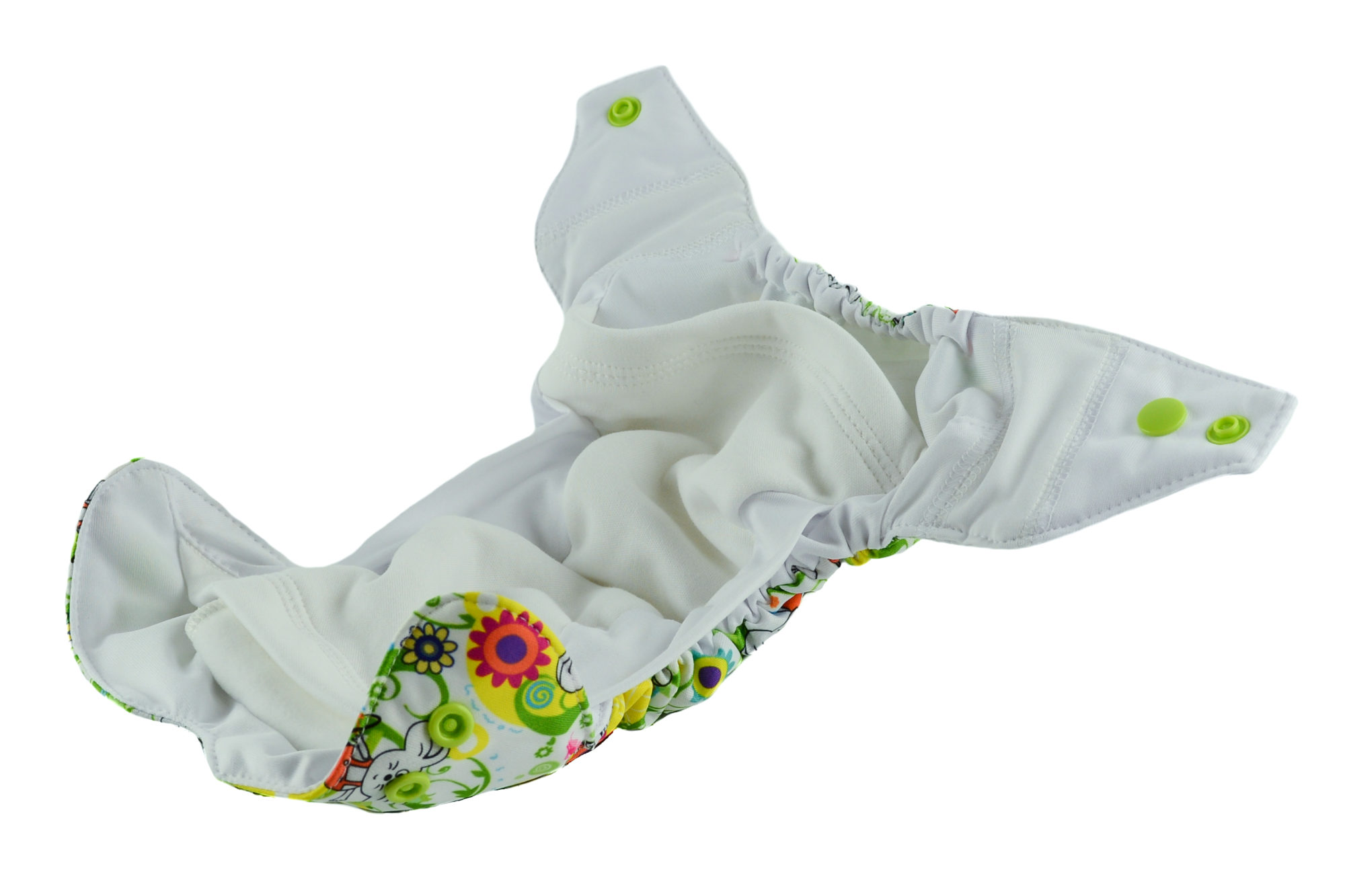 The diaper consists of a colourful, waterproof PUL which protects the clothes from leakage. It is integrated with the absorbent part of the diaper.