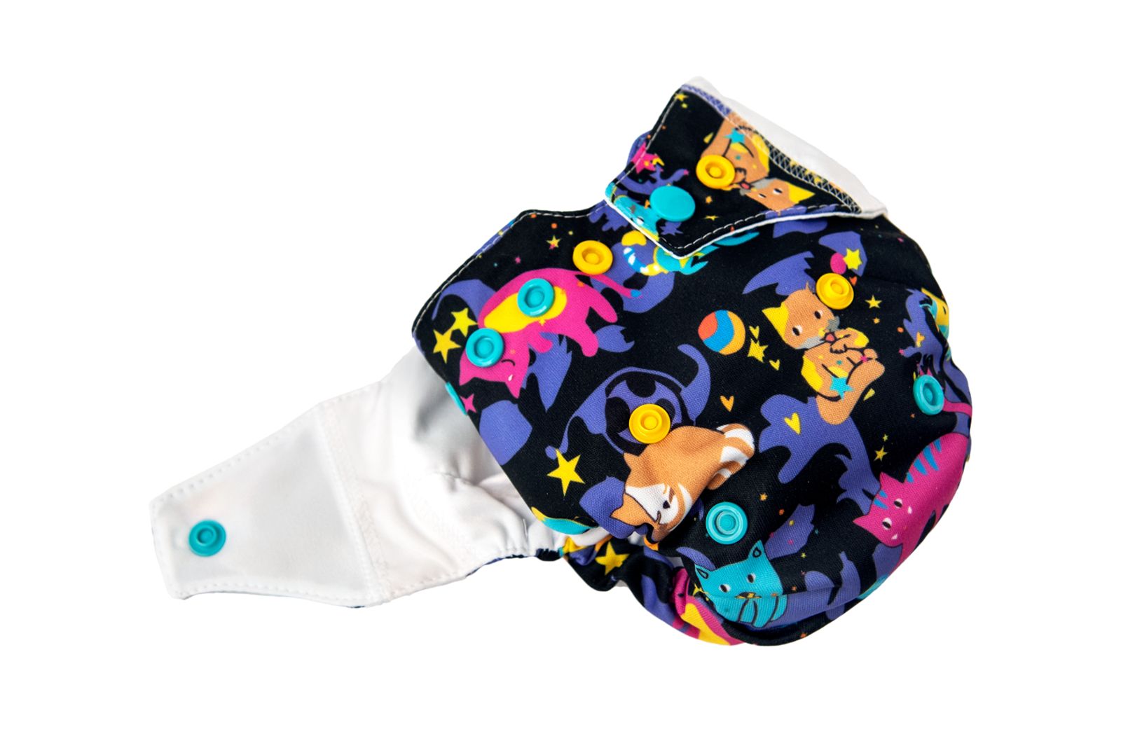The diaper consists of a colourful, waterproof PUL which protects the clothes from leakage. It is integrated with the absorbent part of the diaper.