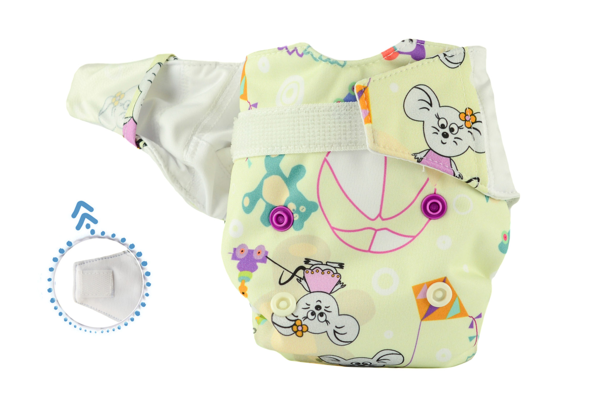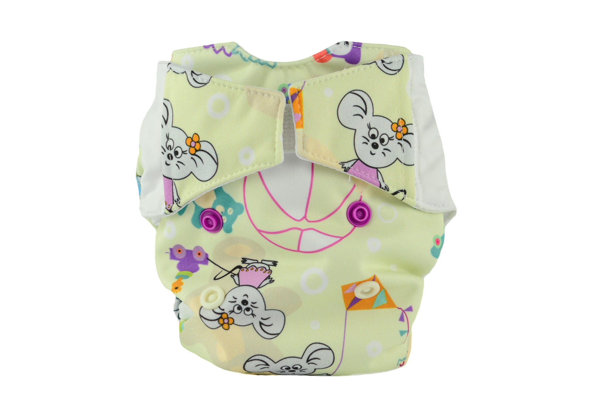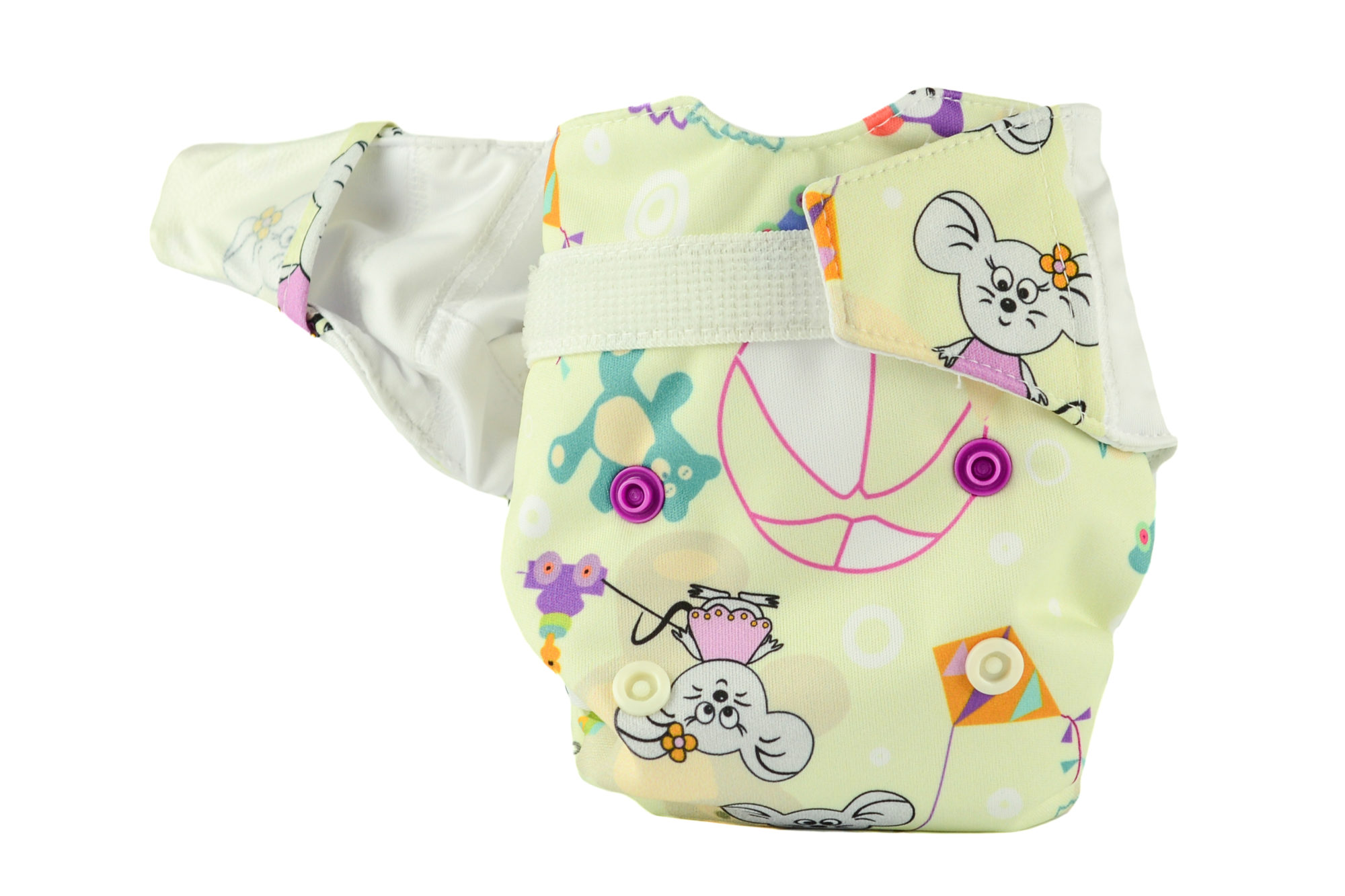 The diaper consists of a colourful, waterproof PUL which protects the clothes from leakage. It is integrated with the absorbent part of the diaper.