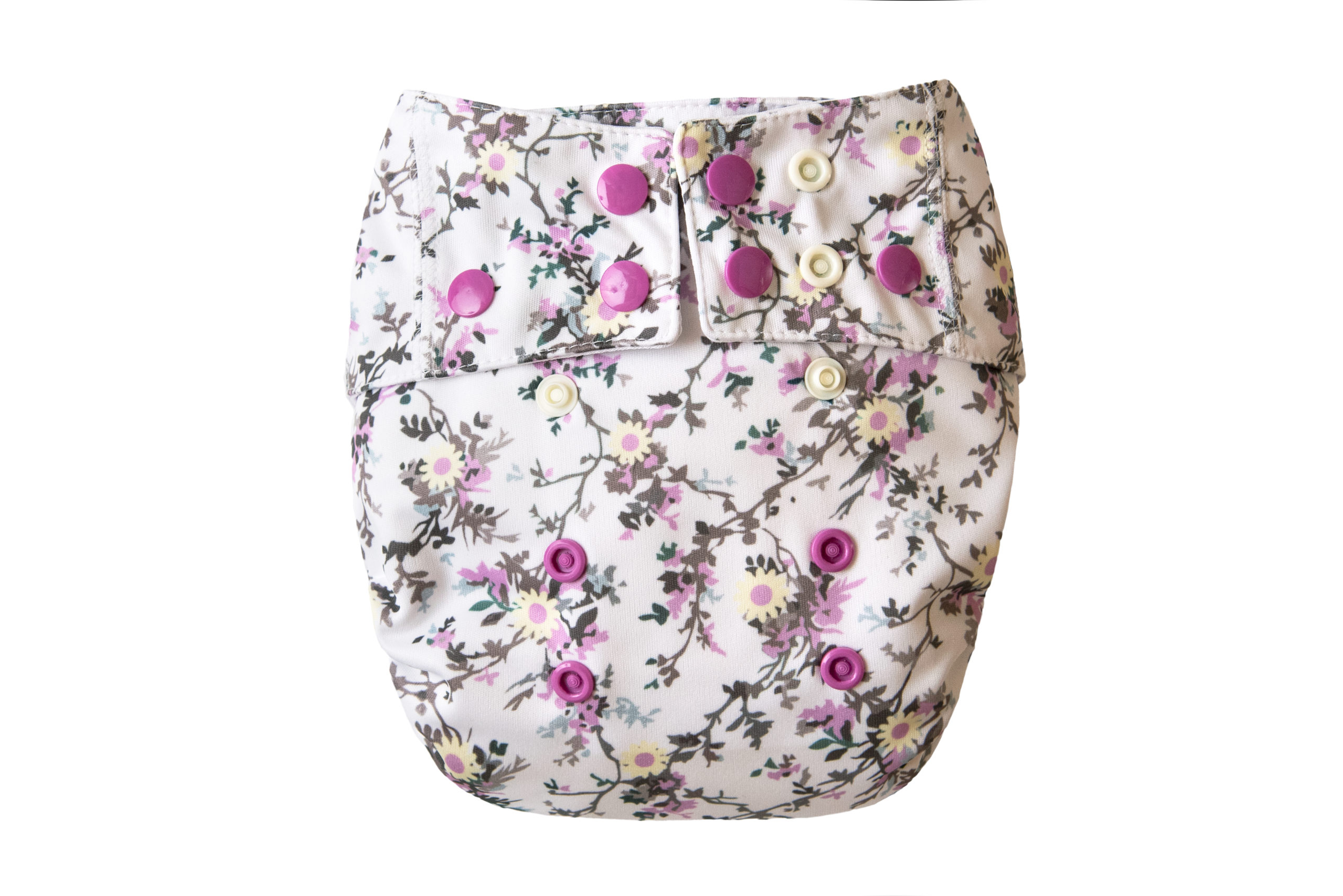 The entire diaper has been very carefully designed. The diaper consists of a colourful, waterproof  PUL fabricon which the absorbent part of the diaper is sewn into.