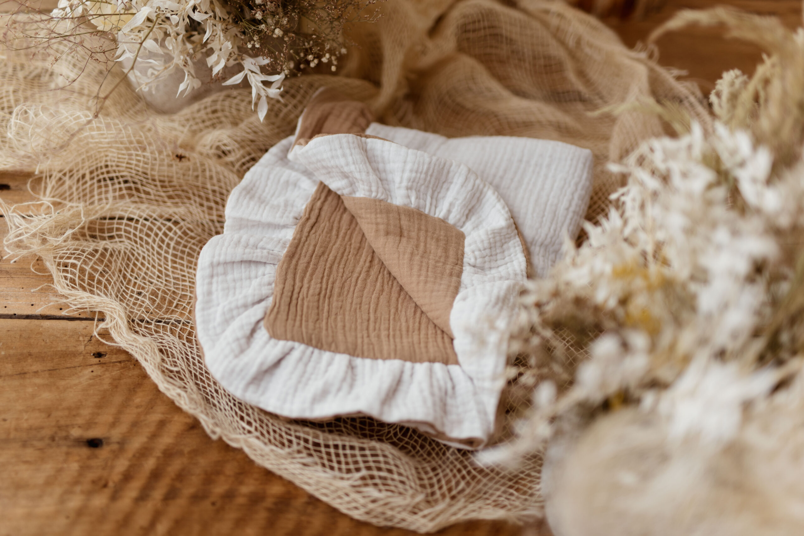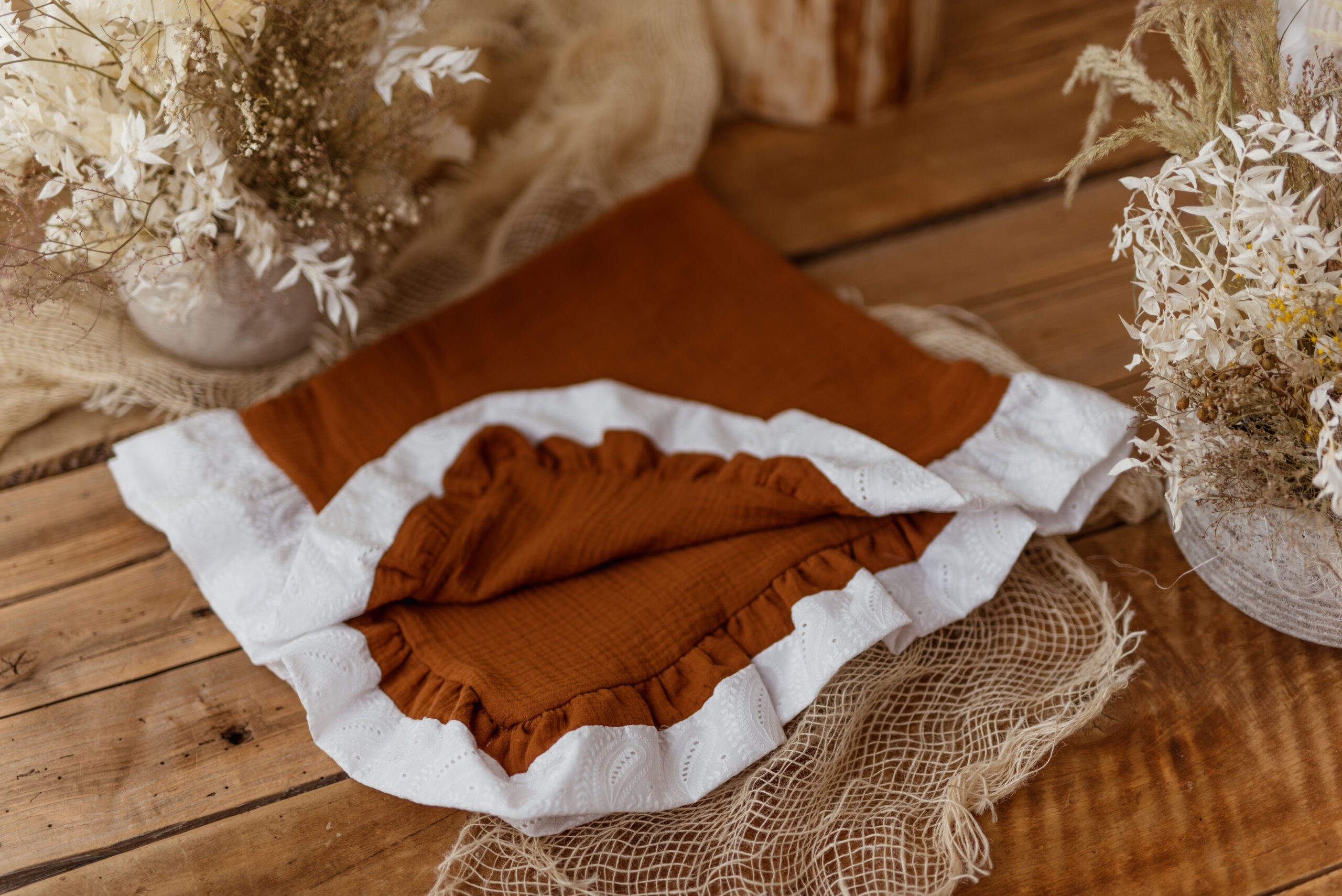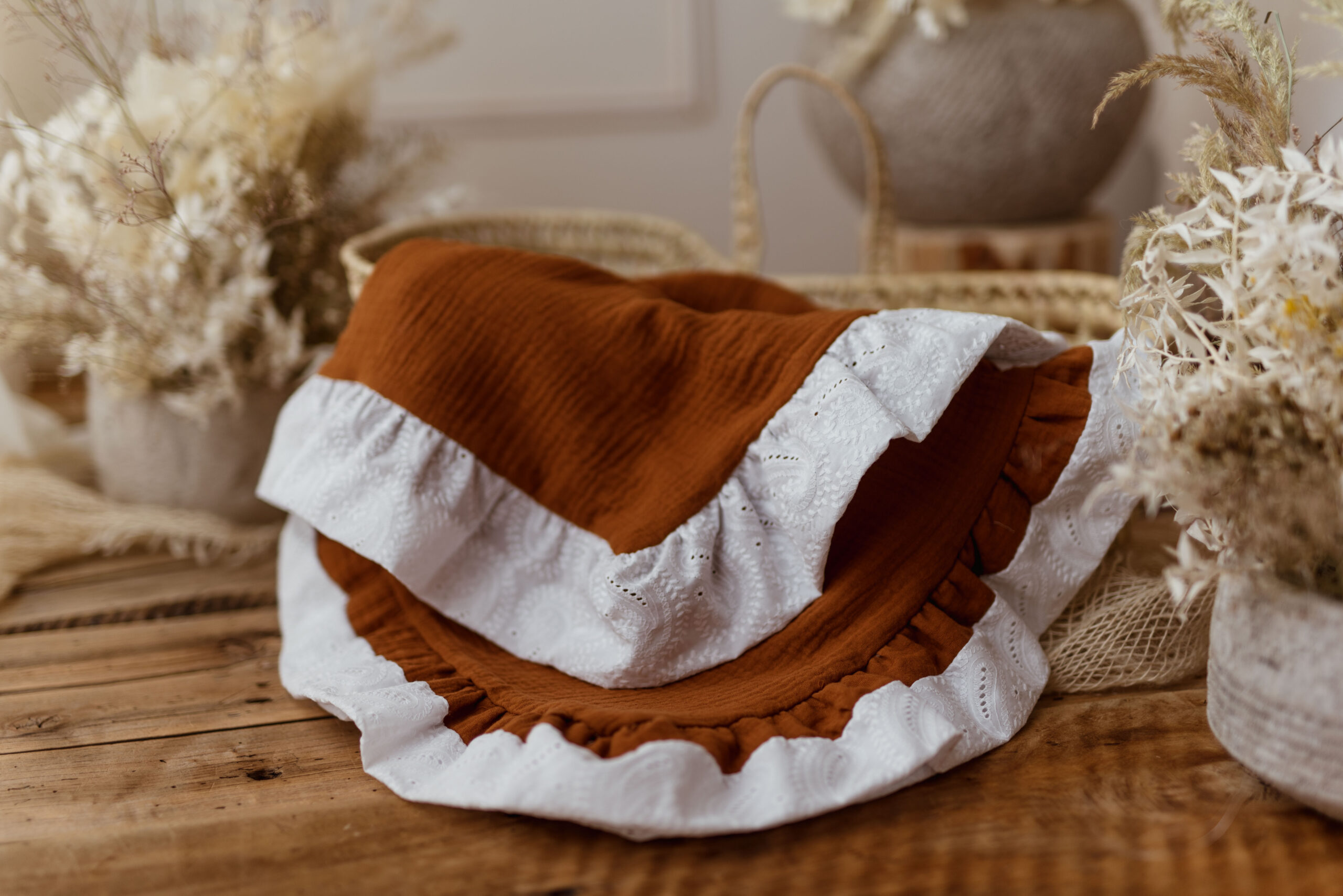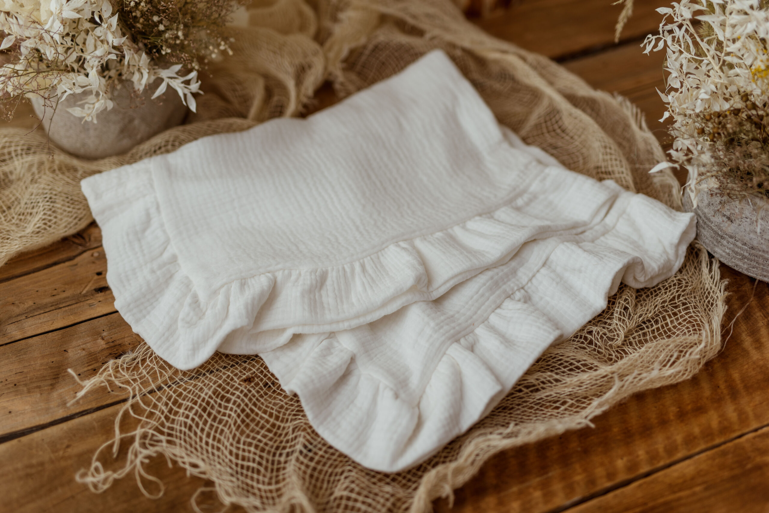 Our muslin blanket consists of two layers of cotton muslin decorated with a ruffled frill around the entire perimeter. The combination of two colors of muslin allows for two-sided use.