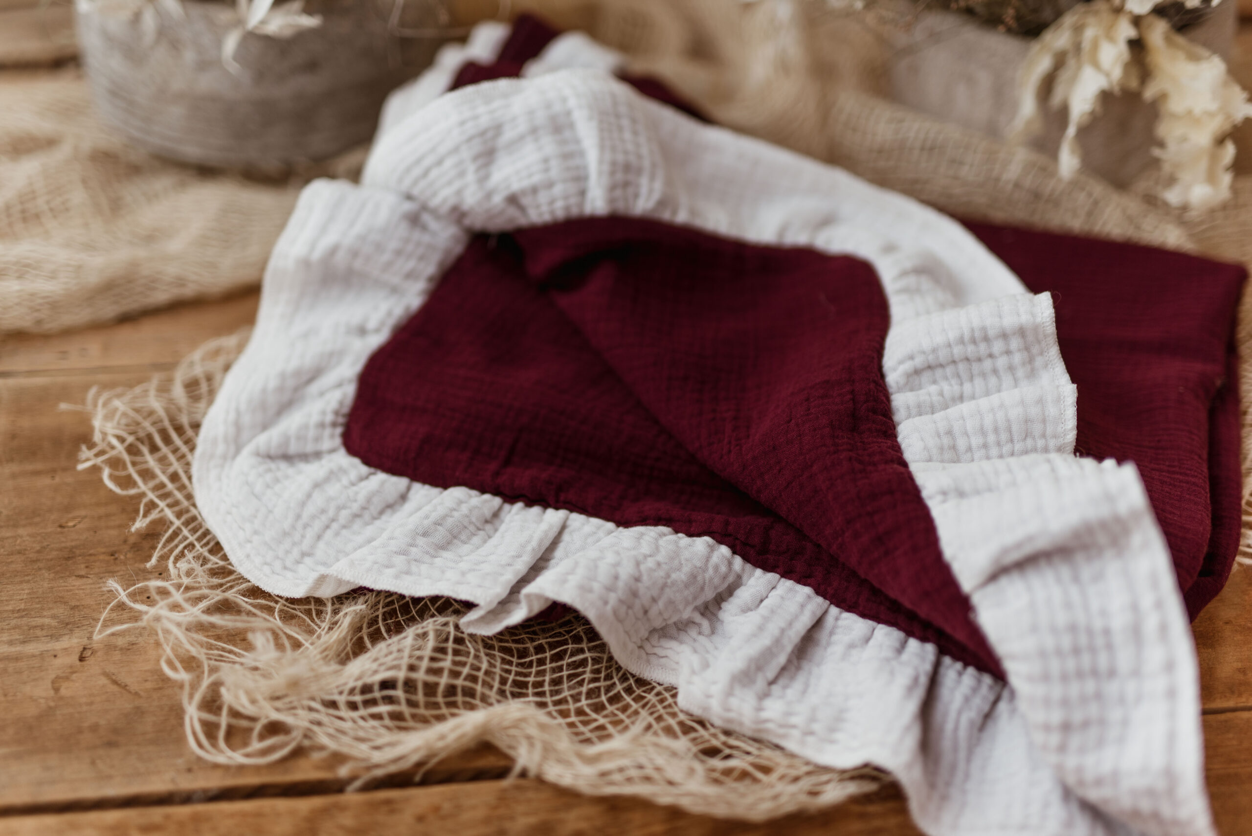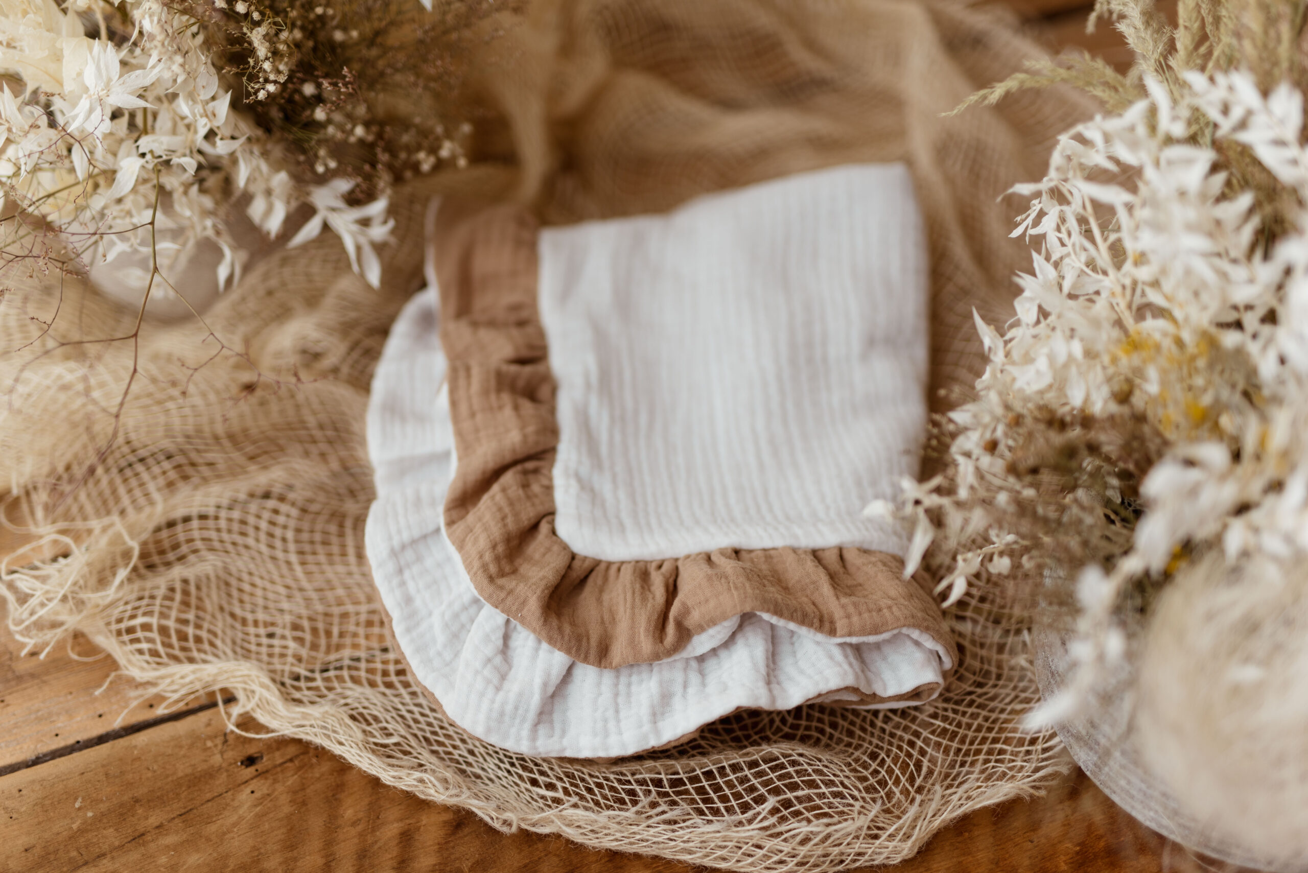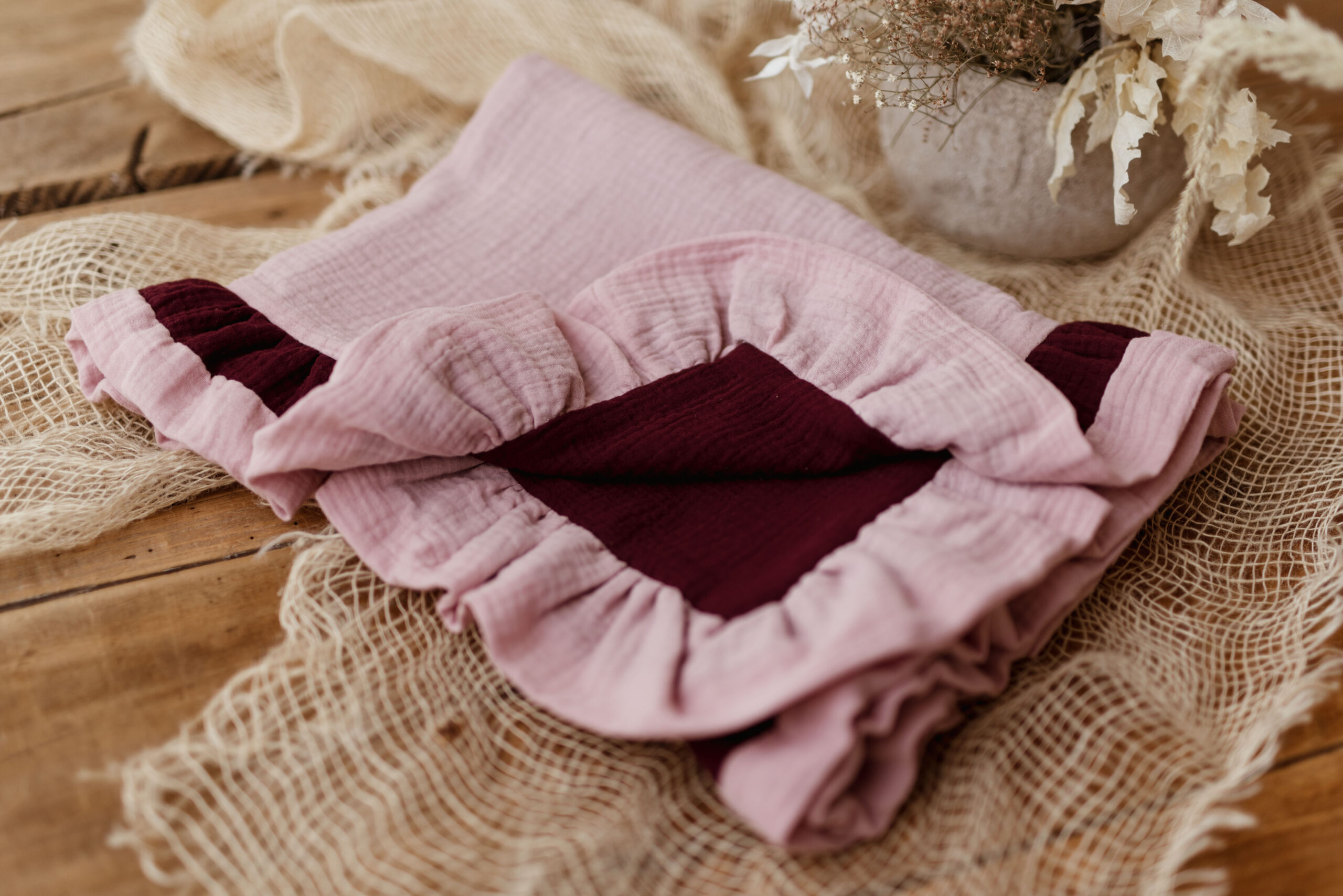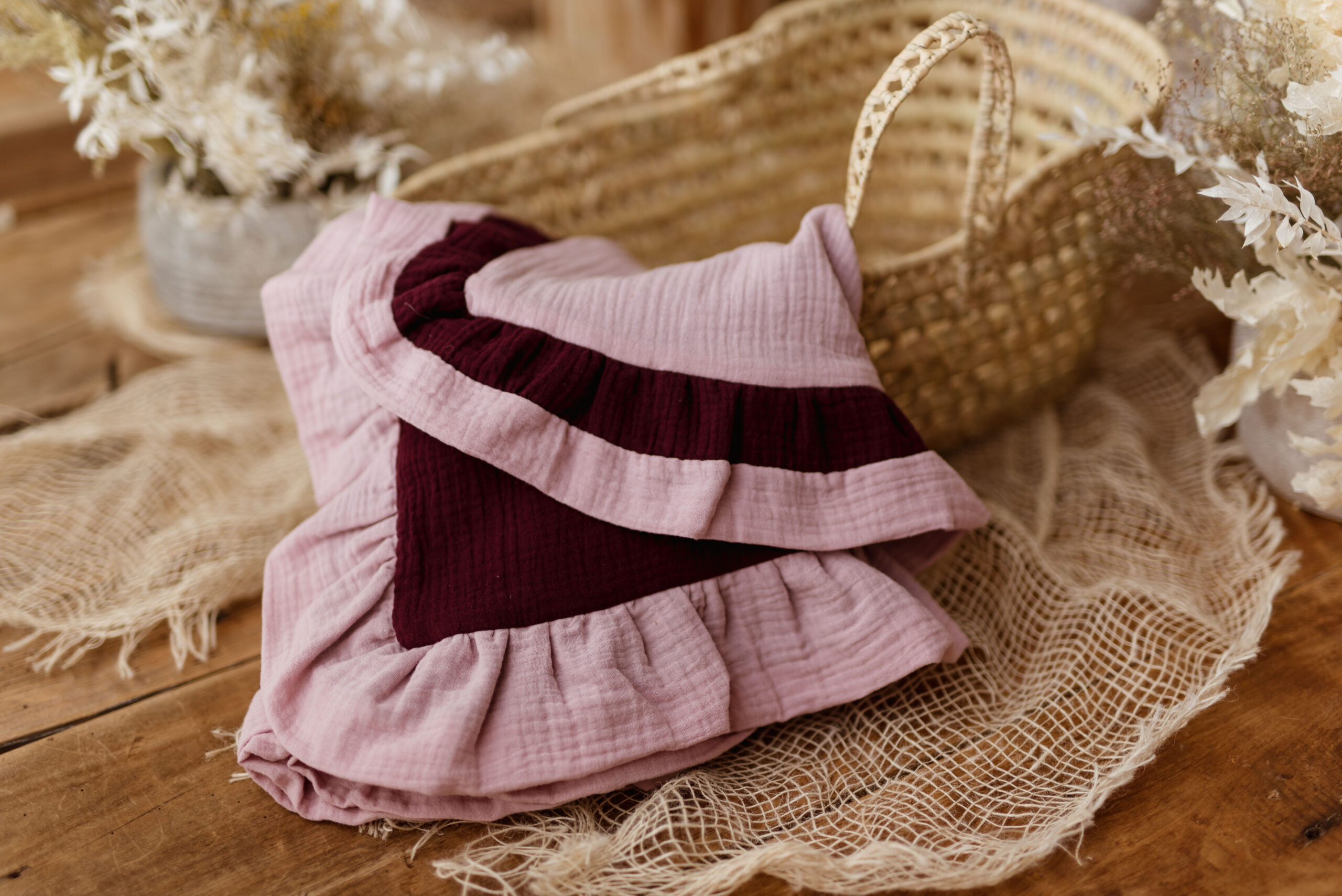 Our muslin blanket consists of two layers of cotton muslin decorated with a ruffled frill around the entire perimeter. The combination of two colors of muslin allows for two-sided use.