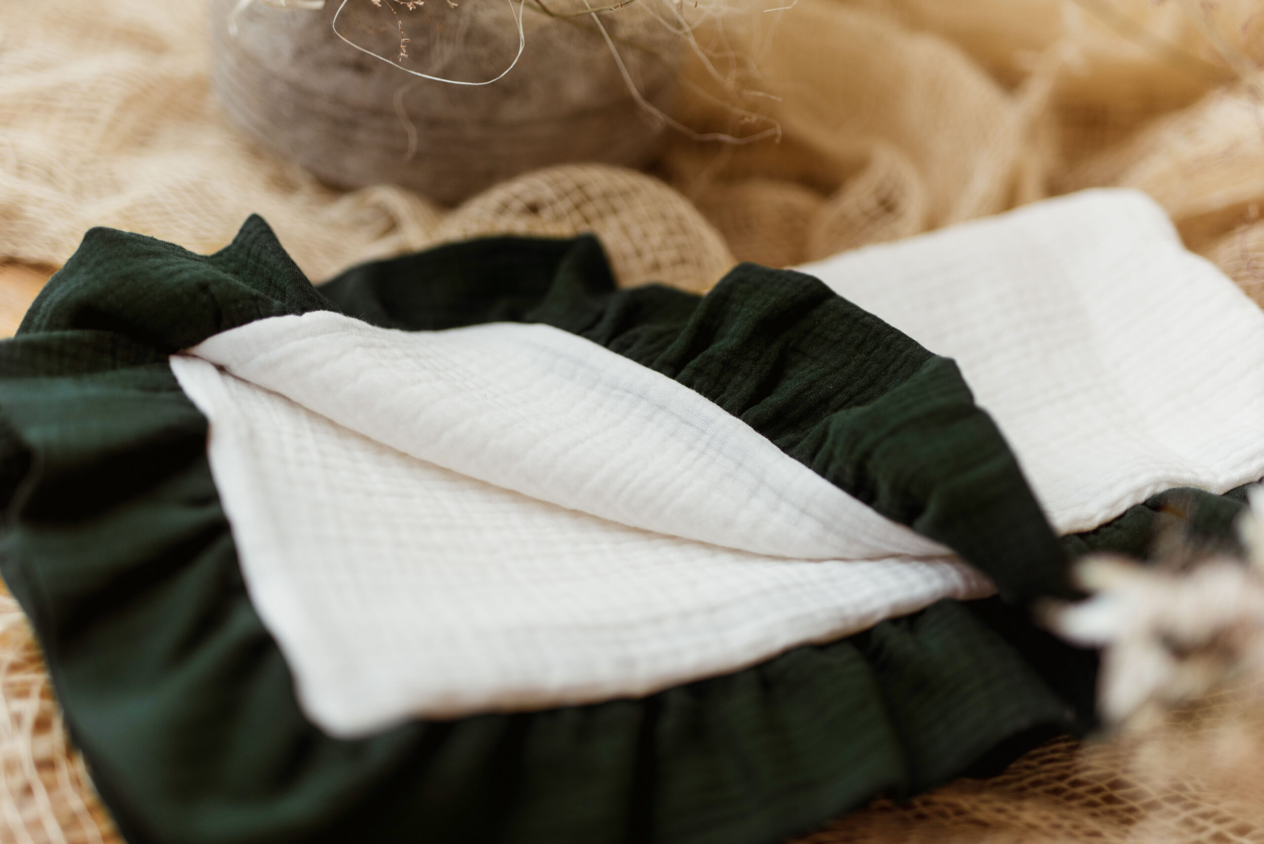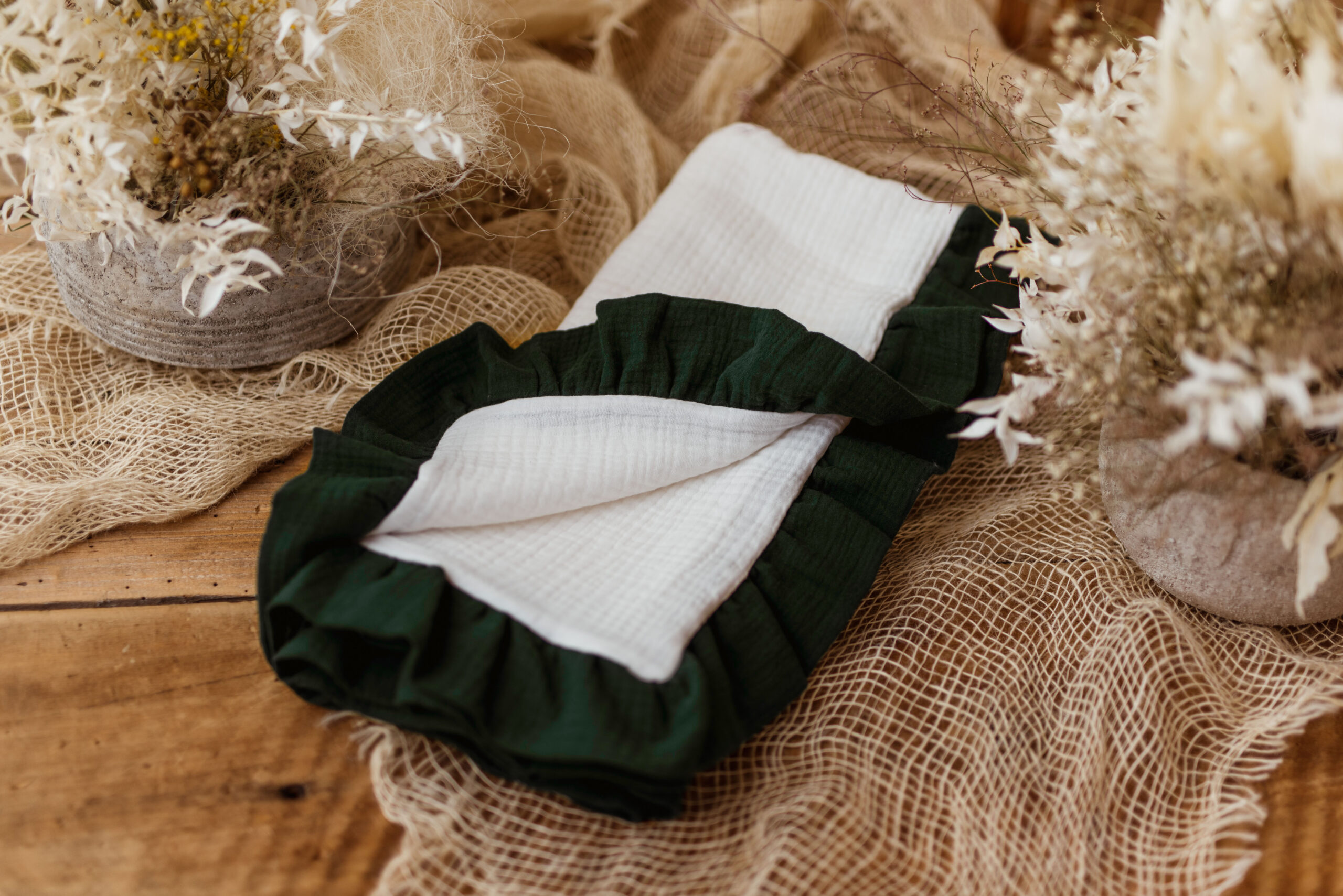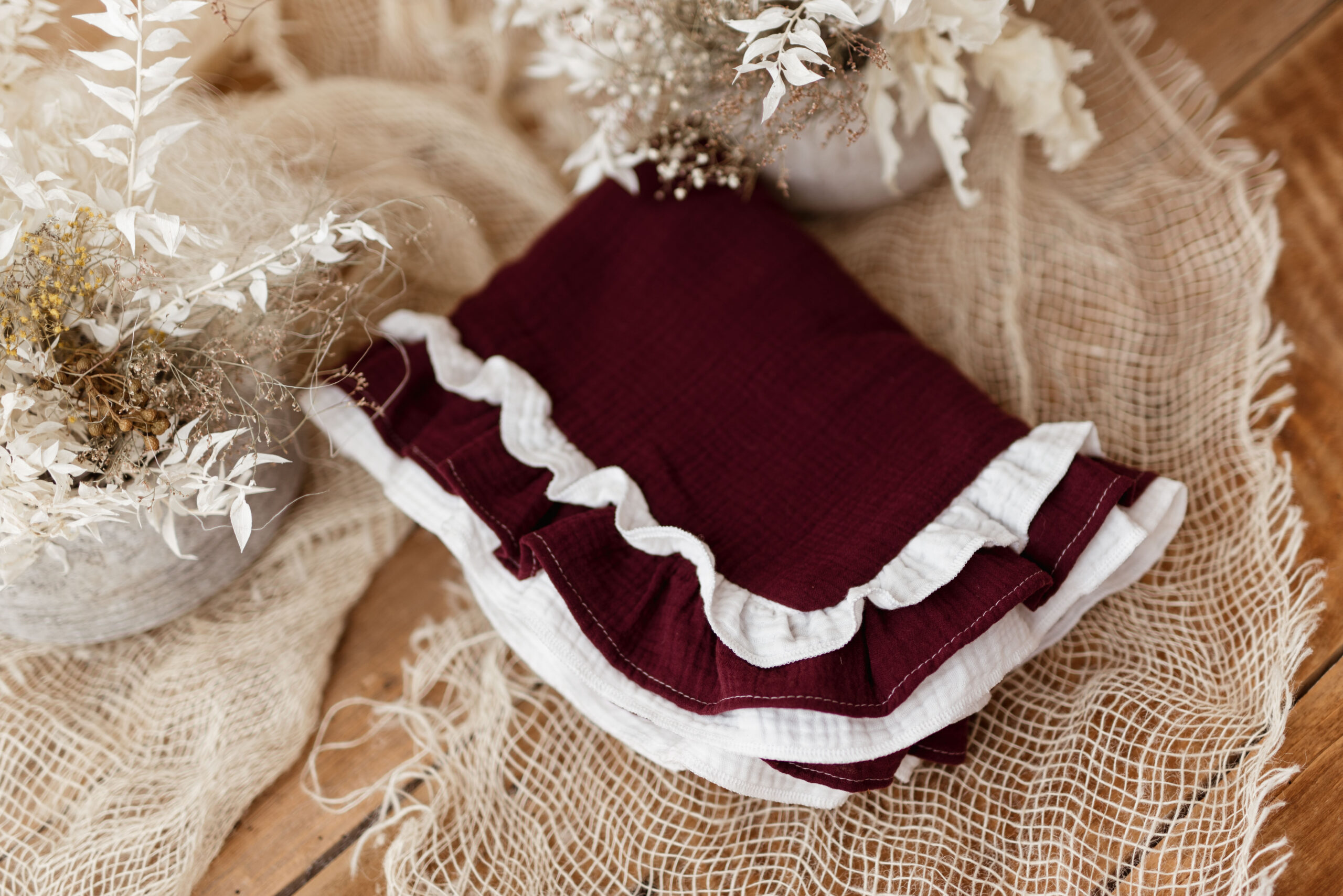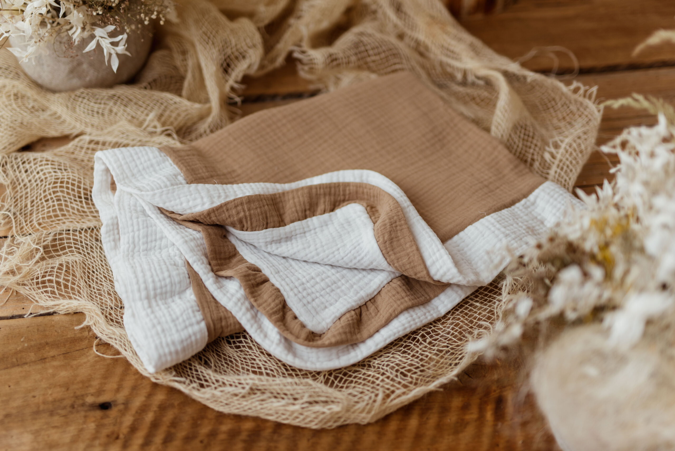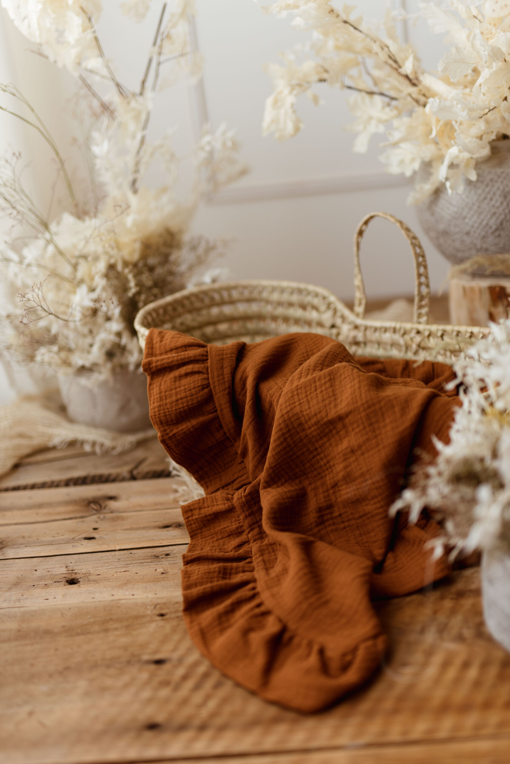 Our muslin blanket consists of two layers of cotton muslin decorated with a ruffled frill around the entire perimeter. The combination of two colors of muslin allows for two-sided use.