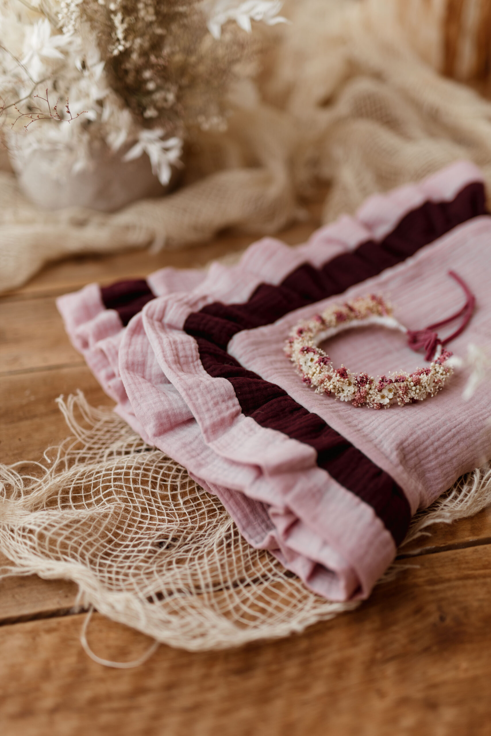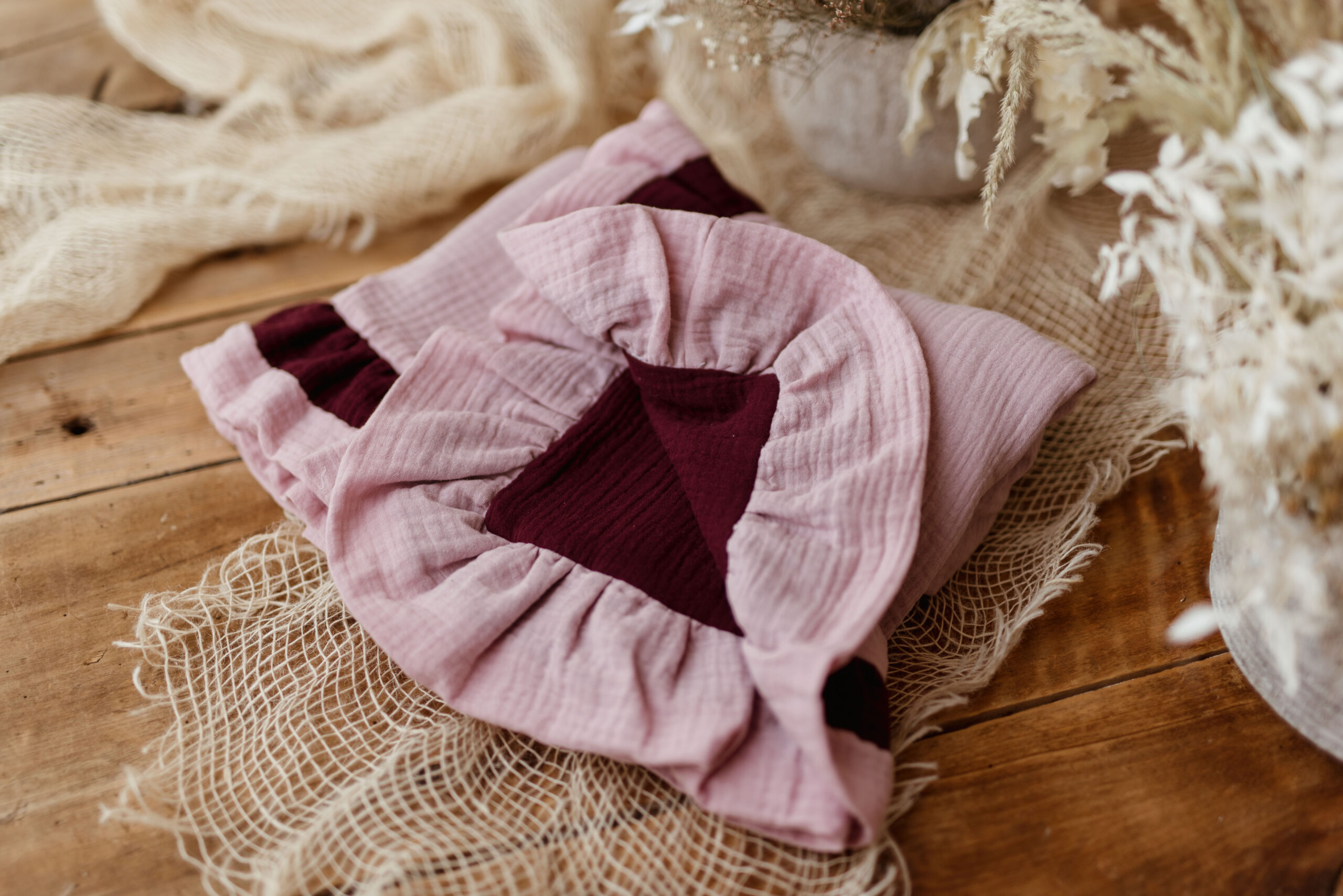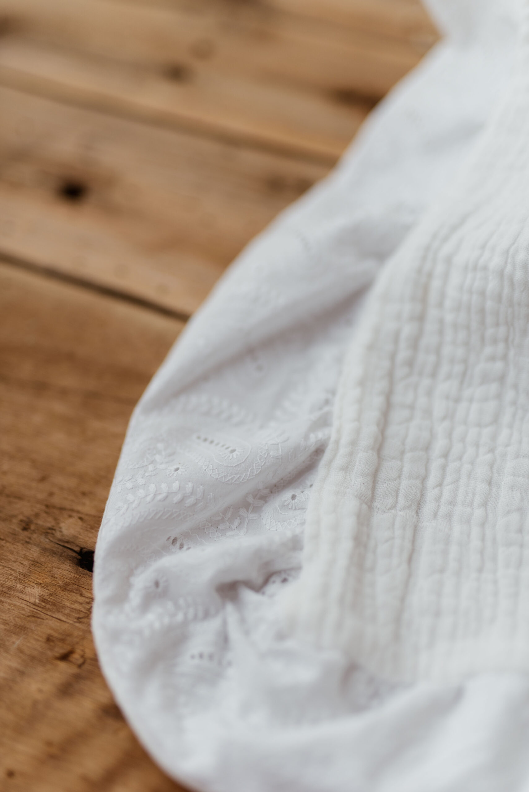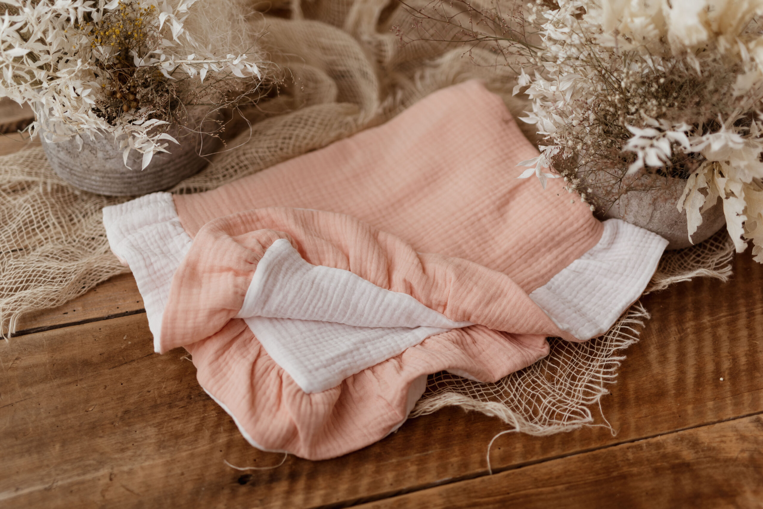Our muslin blanket consists of two layers of cotton muslin decorated with a ruffled frill around the entire perimeter. The combination of two colors of muslin allows for two-sided use.