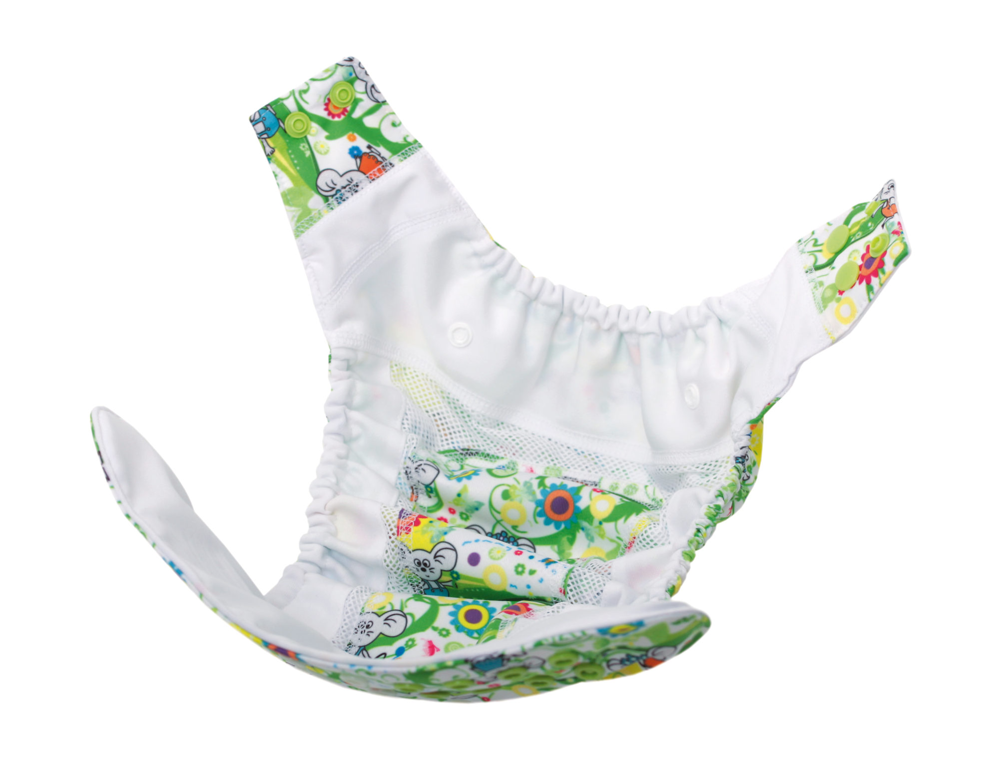 3. A double row of snaps and an elastic band on the leg gussets firmly holds the diapers, protecting the clothes and avoiding messes. The PUL flap situated in the front of the diaper protects from leakage and keeps clothes dry.