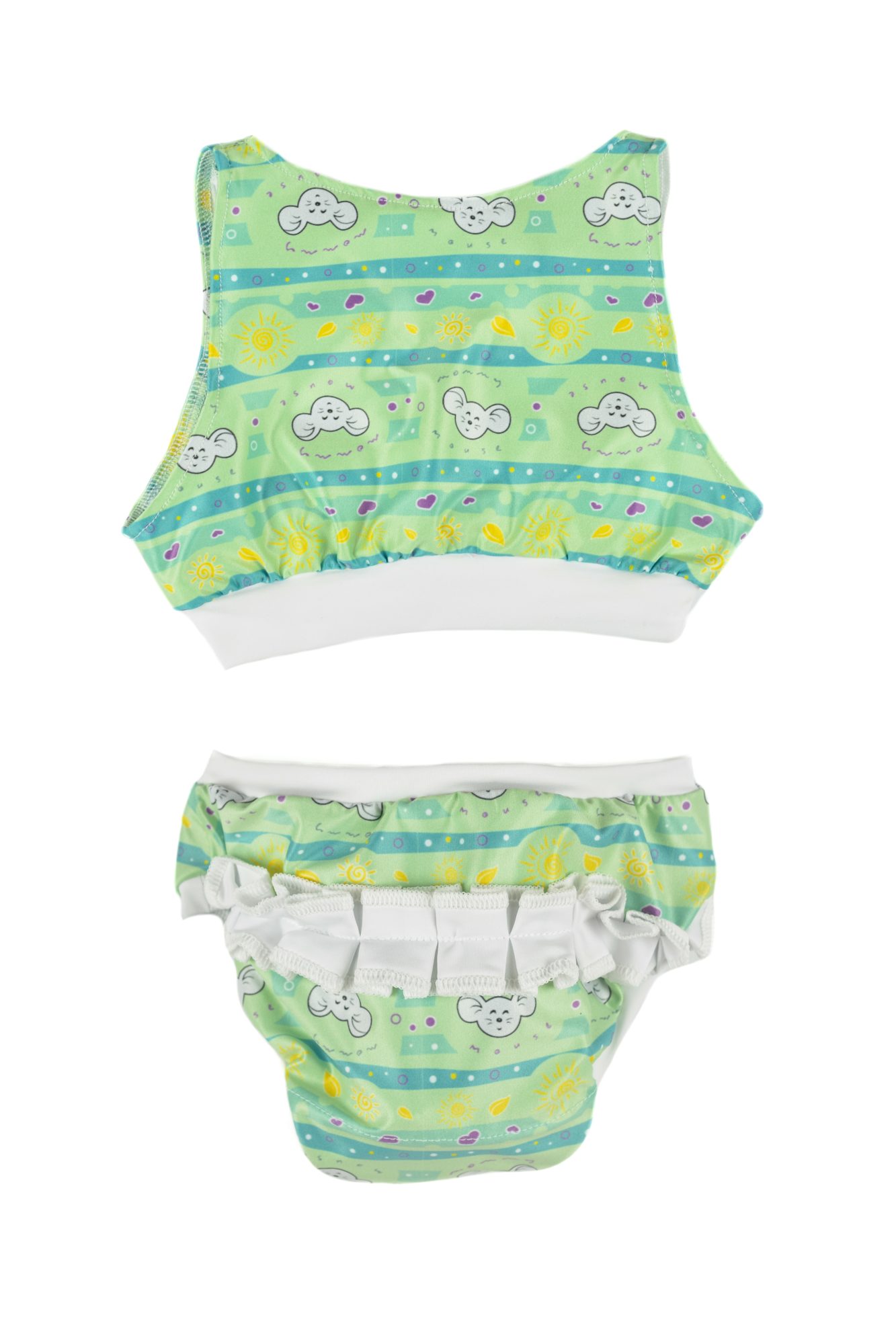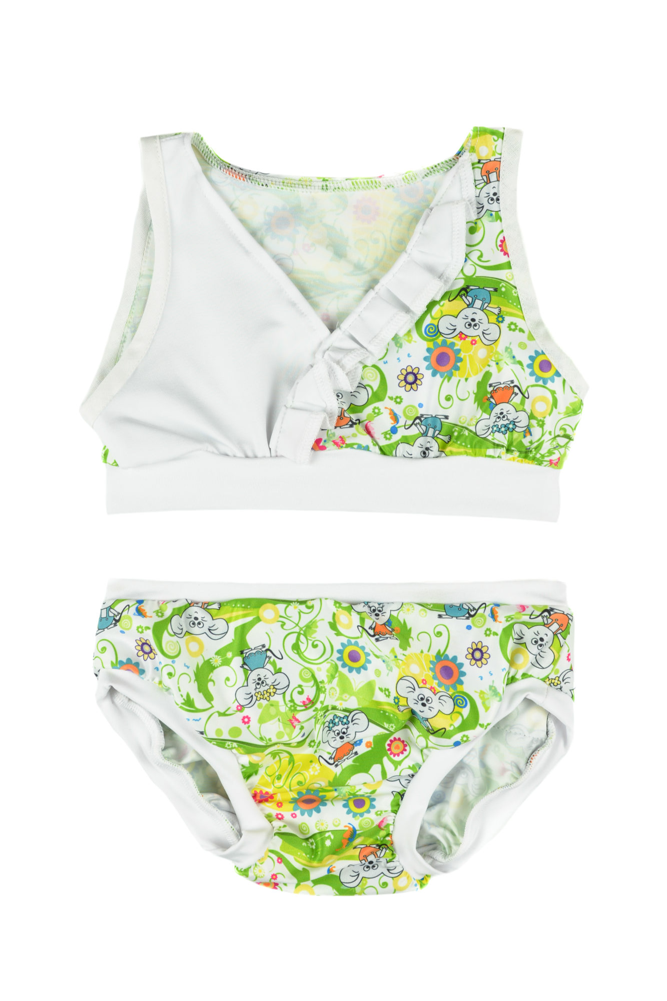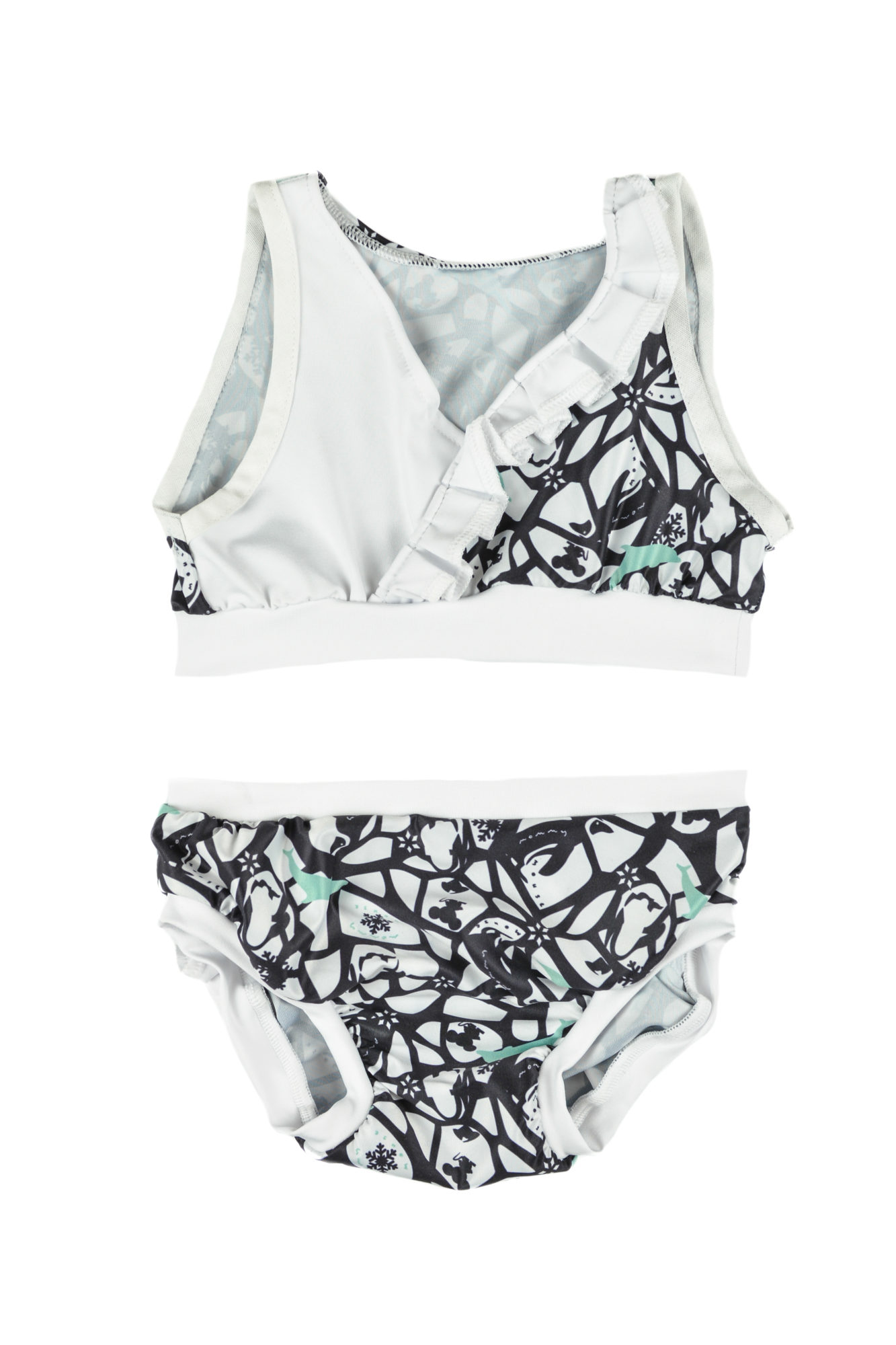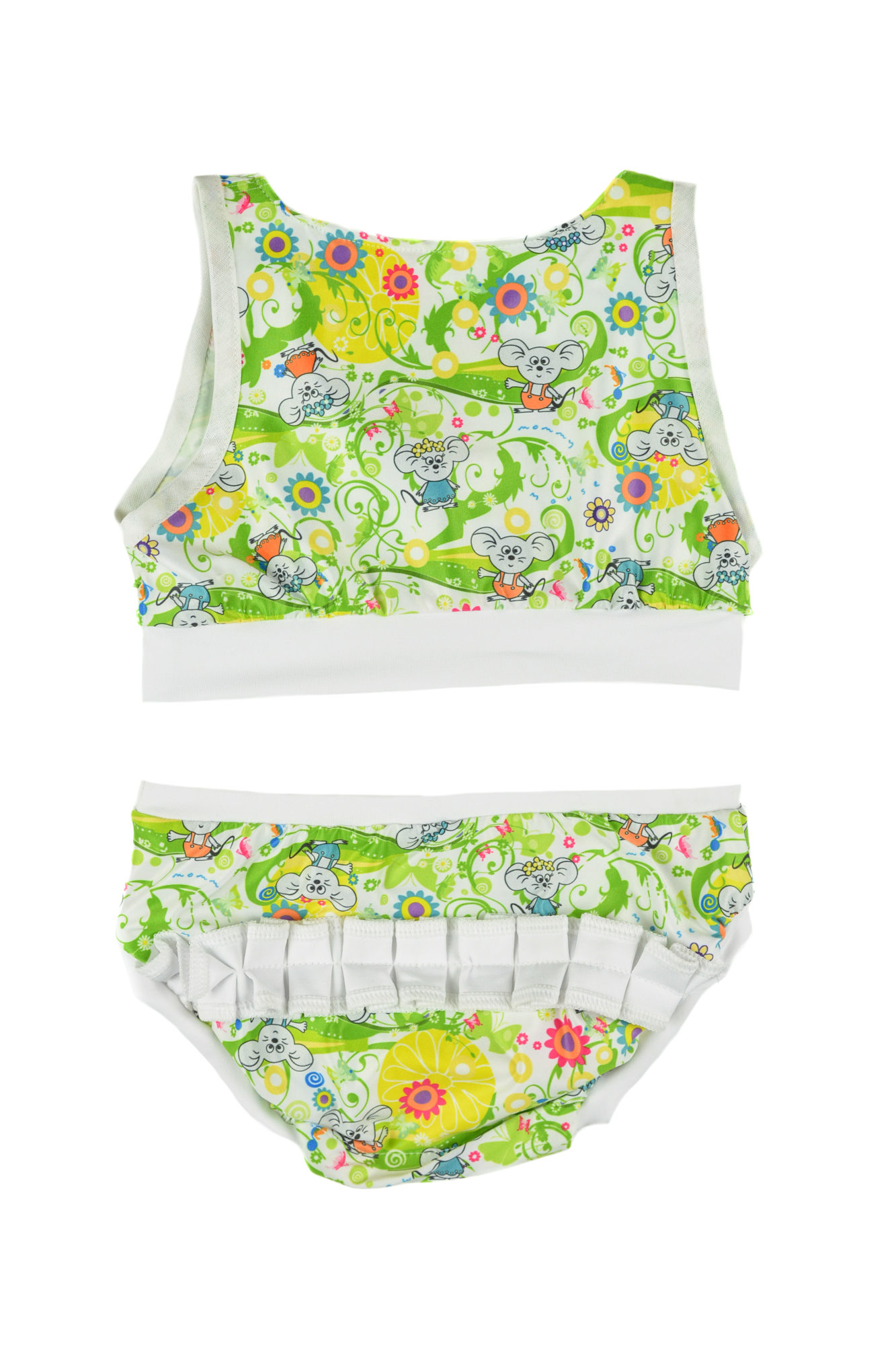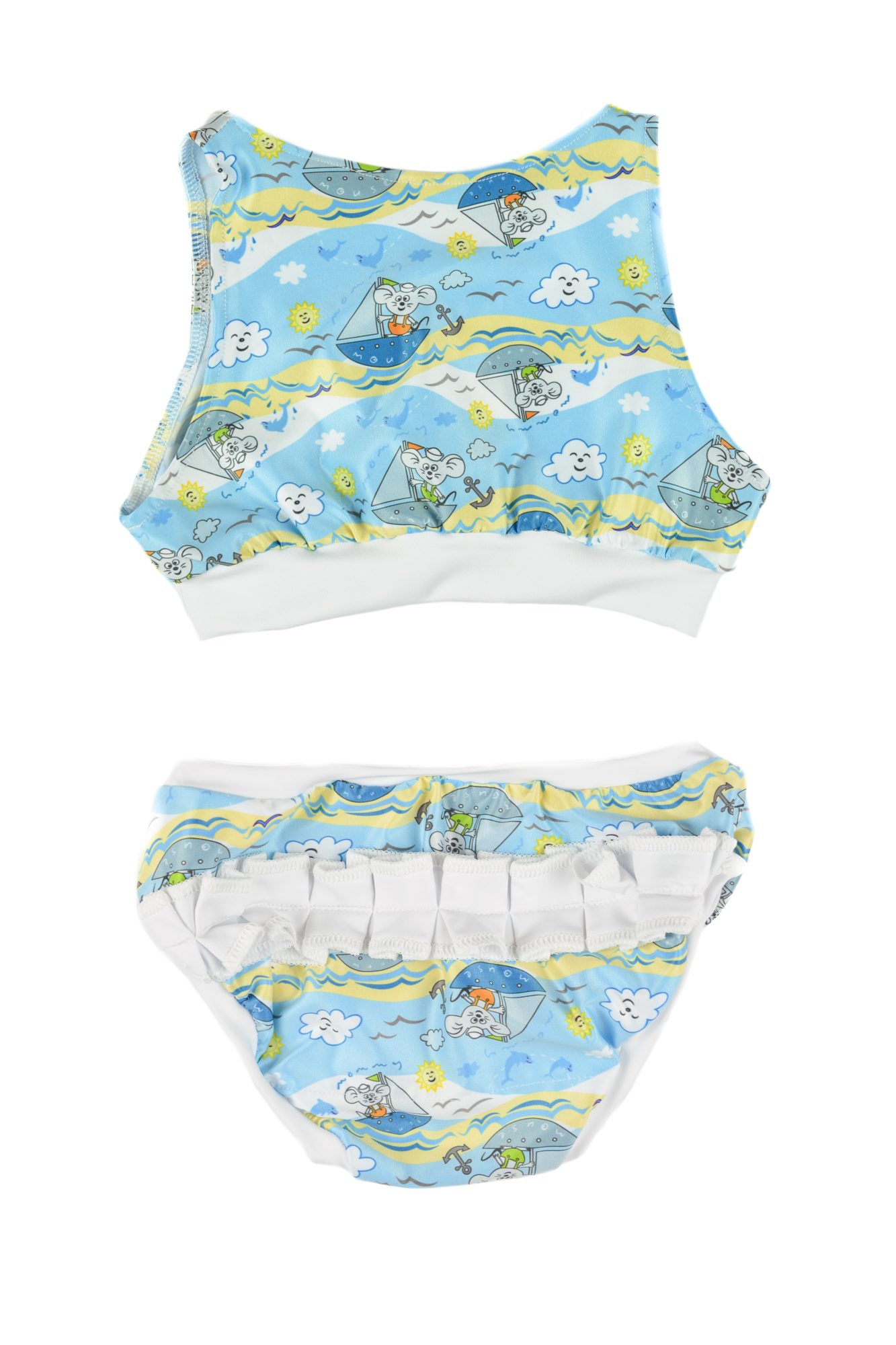 Bikini – short top and figs. Perfect for pool and beaches. A short, decorative blouse (topika) will also perfectly match with short pants or a skirt, giving an attractive swim wear set. The perfect costume adapts to the shape of the figure of a small woman. Decorated with a very girlish frill tutu accent, it adds charm and delicacy to the child’s silhouette.Quick-drying and soft to the touch material provides comfort and resistance to deformation.