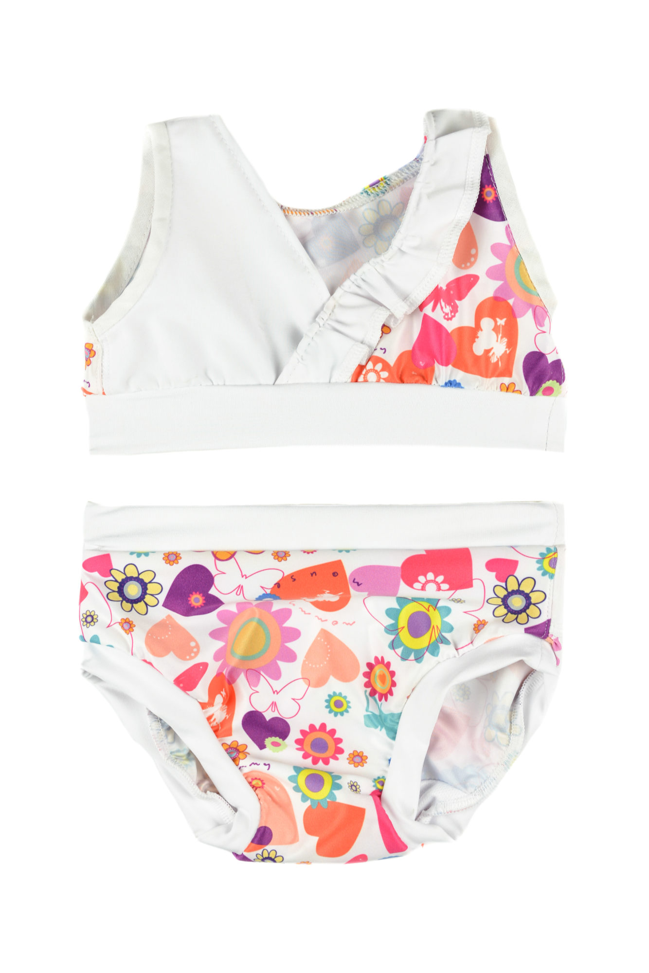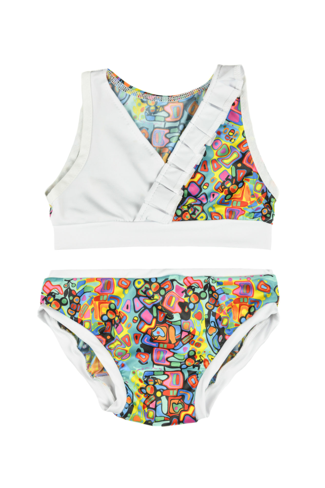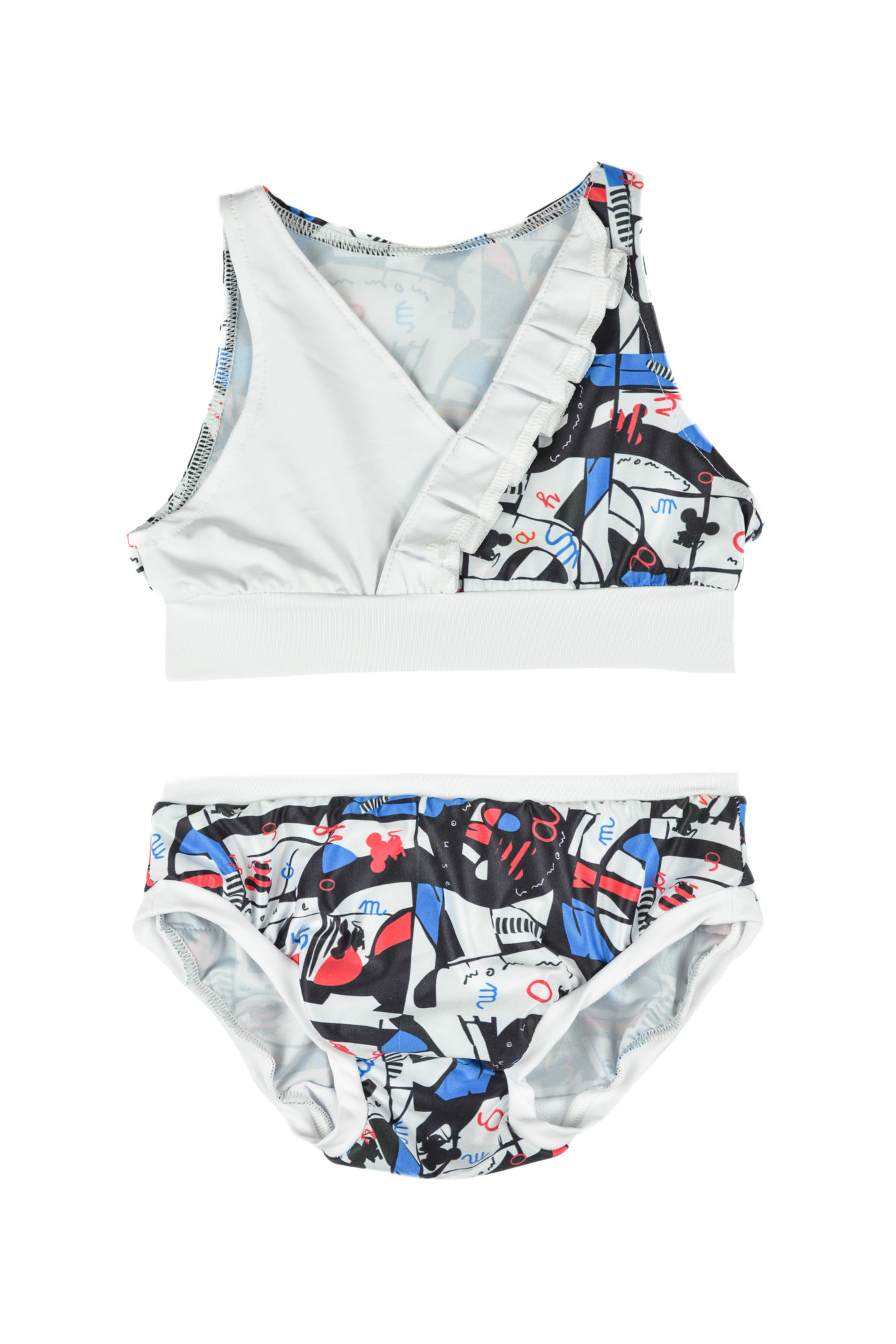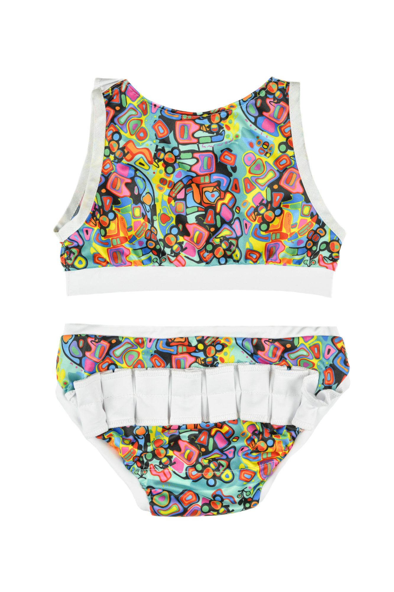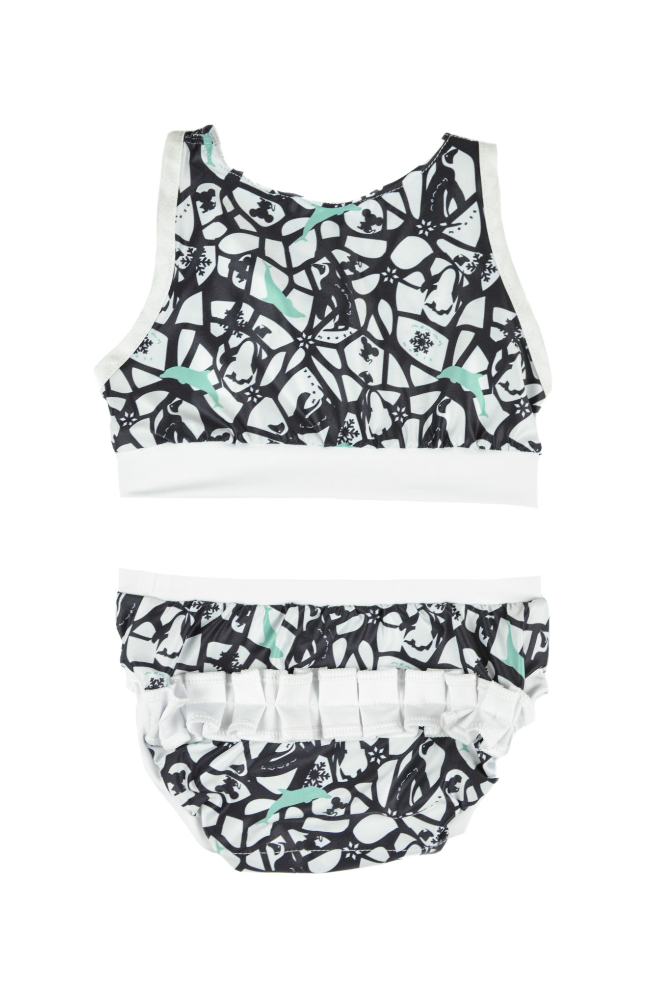 Bikini – short top and figs. Perfect for pool and beaches. A short, decorative blouse (topika) will also perfectly match with short pants or a skirt, giving an attractive swim wear set. The perfect costume adapts to the shape of the figure of a small woman. Decorated with a very girlish frill tutu accent, it adds charm and delicacy to the child’s silhouette.Quick-drying and soft to the touch material provides comfort and resistance to deformation.